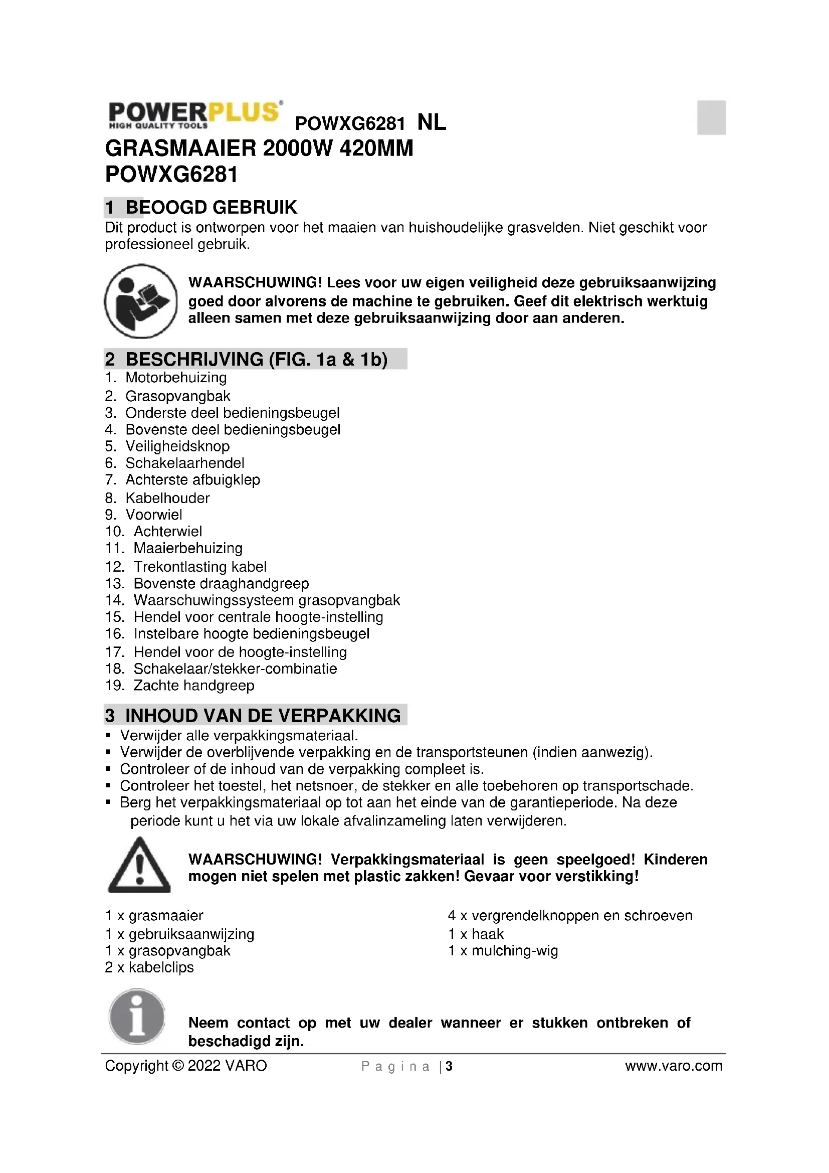 - Berg het verpakkingsmateriaal op tot aan het einde van de garantieperiode. Na deze periode kunt u het via uw lokale afvalinzameling laten verwijderen. WAARSCHUWING! Verpakkingsmateriaal is geen speelgoed! Kinderen mogen niet spelen met plastic zakken! Gevaar voor verstikking! 1 x grasmaaier 1 x gebruiksaanwijzing 1 x grasopvangbak 2 x kabelclips 4 x vergrendelknoppen en schroeven 1 x haak 1 x mulching-wig Neem contact op met uw dealer wanneer er stukken ontbreken of beschadigd zijn.POWXG6281 NL Copyright © 2022 VARO P a g i n a | 4 www.varo.com
