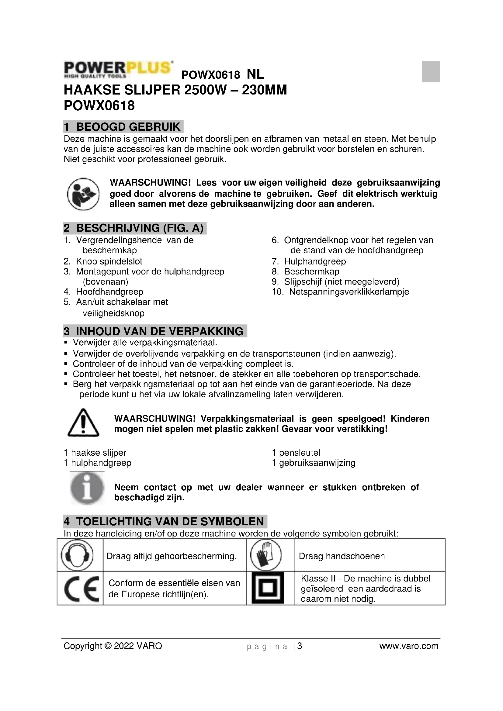 Klasse II - De machine is dubbel geïsoleerd een aardedraad is daarom niet nodig.POWX0618 NL Copyright © 2022 VARO p a g i n a | 4 www.varo.com