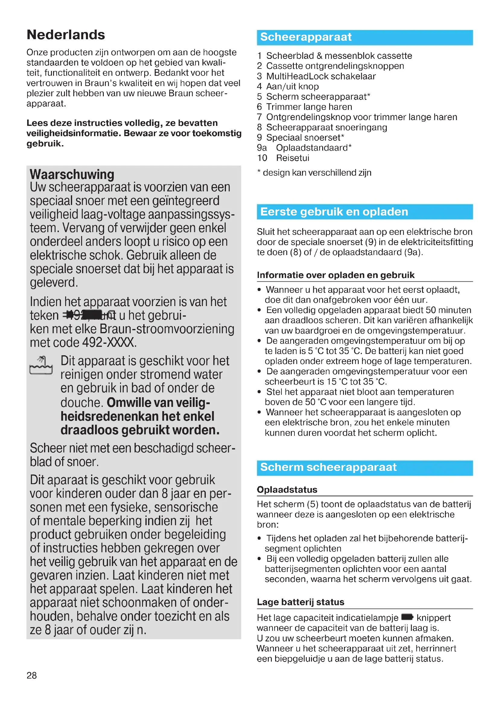 Il rasoio si spegne con la batteria completamente carica. Lamina e blocco lame sono usurati e pertanto richiedono più energia a ogni rasatura. L’apparecchio si spegne. – Sostituire il blocco radente. – Lubrificare regolarmente il sistema radente, soprattutto se si effettua la pulizia soltanto con l’acqua. 91154595_Series_9-2_Solo_Euro_S6-96.indd 27 28.11.16 13:0928 Nederlands Onze producten zijn ontworpen om aan de hoogste standaarden te voldoen op het gebied van kwali- teit, functionaliteit en ontwerp. Bedankt voor het vertrouwen in Braun’s kwaliteit en wij hopen dat veel plezier zult hebben van uw nieuwe Braun scheer- apparaat. Lees deze instructies volledig, ze bevatten veiligheidsinformatie. Bewaar ze voor toekomstig gebruik. Waarschuwing Uw scheerapparaat is voorzien van een speciaal snoer met een geïntegreerd veiligheid laag-voltage aanpassingssys- teem. Vervang of verwijder geen enkel onderdeel anders loopt u risico op een elektrische schok. Gebruik alleen de speciale snoerset dat bij het apparaat is geleverd. Indien het apparaat voorzien is van het teken 492, kunt u het gebrui- ken met elke Braun-stroomvoorziening met code 492-XXXX. Dit apparaat is geschikt voor het reinigen onder stromend water en gebruik in bad of onder de douche. Omwille van veilig- heids redenen kan het enkel draadloos gebruikt worden. Scheer niet met een beschadigd scheer- blad of snoer. Dit aparaat is geschikt voor gebruik voor kinderen ouder dan 8 jaar en per- sonen met een fysieke, sensorische of mentale beperking indien zij het product gebruiken onder begeleiding of instructies hebben gekregen over het veilig gebruik van het apparaat en de gevaren inzien. Laat kinderen niet met het apparaat spelen. Laat kinderen het apparaat niet schoonmaken of onder- houden, behalve onder toezicht en als ze 8 jaar of ouder zij n. Scheerapparaat 1 Scheerblad & messenblok cassette 2 Cassette ontgrendelingsknoppen 3 MultiHeadLock schakelaar 4 Aan/uit knop 5 Scherm scheerapparaat* 6 Trimmer lange haren 7 Ontgrendelingsknop voor trimmer lange haren 8 Scheerapparaat snoeringang 9 Speciaal snoerset* 9a Oplaadstandaard* 10 Reisetui