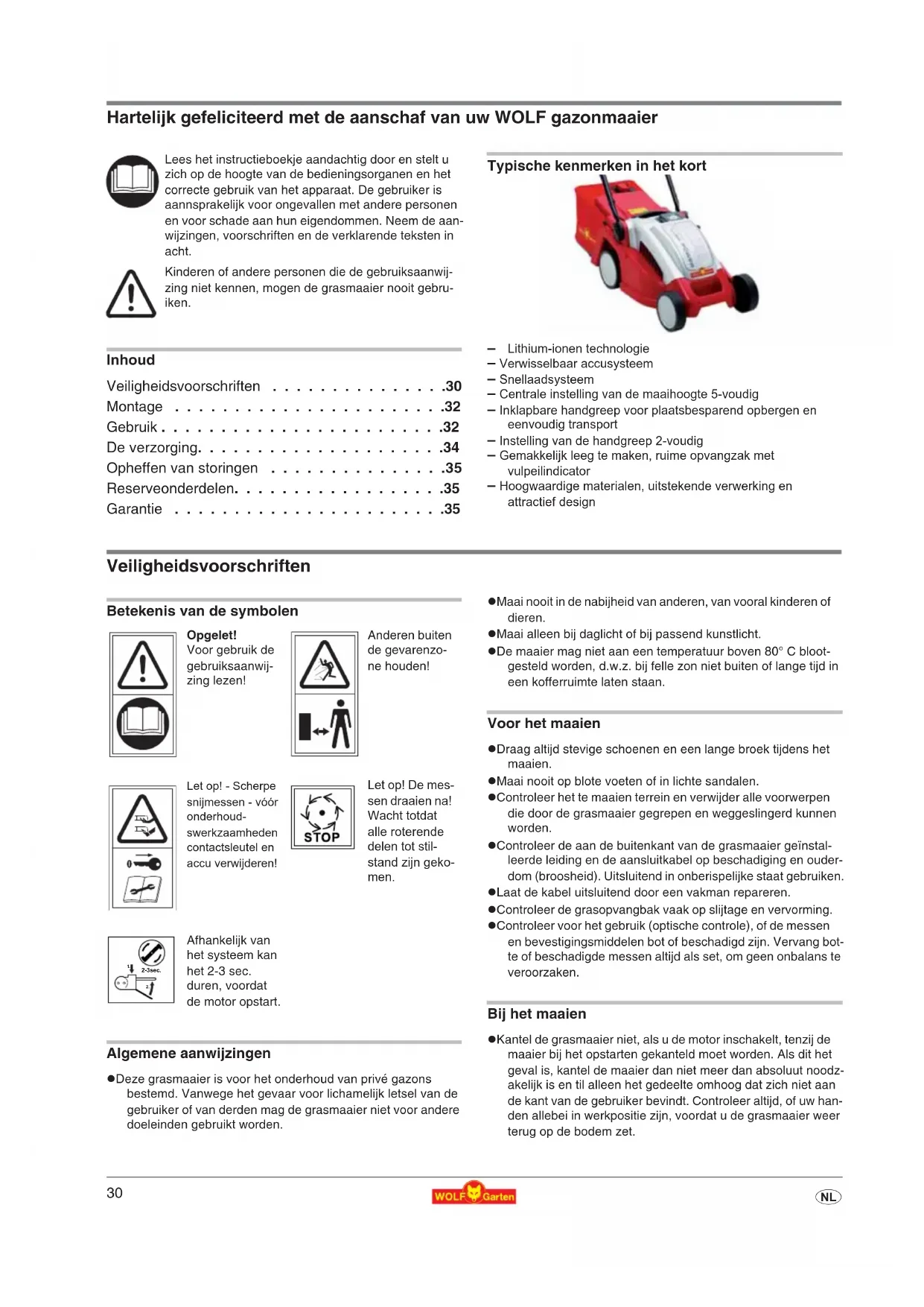 z Houdt de veiligheidsafstand aan die door de stang van de handgreep aangegeven is. z Zet de motor pas aan, als uw voeten zich op een veilige af- stand van de messen bevinden. z Let op een stabiele stand, vooral op een helling. Nooit snel, maar altijd rustig naar voren lopen. z Op hellende plaatsen maaien: – Maai altijd dwars op de helling, niet op- en neerwaarts – Wees zeer voorzichtig als u van richting verandert – Maai niet op steile hellingen z Wees zeer voorzichtig als u terugwaarts maait en de maaier naar u toe trekt. z Voorzichtig, grijp niet naar lopende snijkanten. z Ga niet voor de grasuitwerpopening staan. z Open de veiligheidsklep nooit als de motor nog loopt. z Rij nooit met een lopende motor over grind – steenslag! z Maai zo mogelijk niet in nat gras. z Onder de volgende omstandigheden moet het apparaat uitgeschakeld en de contactsleutel uitgetrokken worden en moet het apparaat tot stilstand gekomen zijn: – bij het achterlaten van de maaier – om een geblokkeerd mes vrij te maken – om de maaihoogte in te stellen – om de opvangzak leeg te maken – als een vreemd voorwerp geraakt werd (controleer dan eerst, of de maaier of de snijgereedschappen beschadigd zijn. Verhelp in dit geval dan eerst de beschadiging). – als de maaier door onbalans sterk vibreert (onmiddellijk uitschakelen en de oorzaak zoeken) – als de aansluitleiding tijdens het gebruik beschadigd wordt – om de maaier op te tillen of weg te dragen – om de maaier te kantelen of te transporteren (bijv. van-/ naar het gazon of over een weg) Het onderhoud 1 Opgelet! Roterend snijmes. Vóór al het onderhoud en schoonmaakwerk: z Contactsleutel en accu verwijderen. z Raak de draaiende messen niet aan. z Controleer regelmatig of alle zichtbare bevestigingsschroeven en moeren, vooral die van de messenbalk, goed vast zitten en draai ze zonodig aan. z Plaats de grasmaaier niet in vochtige ruimtes. z Vervang om veiligheidsredenen versleten of beschadigde delen. z Gebruik uitsluitend originele onderdelen van WOLF, anders heeft u geen garantie, dat uw grasmaaier voldoet aan de vei- ligheidsvoorschriften. Acculader z Deze oplader is alleen geschikt voor het opladen van de WOLF- Accu gazonmaaier LI-ION POWER 34. z Gebruik de oplader nooit in voochtige of natte omgeving, al- leen gebruiken in afgesloten ruimtes. z Trek de kabel er alleen uit door aan de stekker te trekken. Trekken aan kabel lan de kabel en de stekker beschadigen, waardoor de elektrische zekerheid niet meer gewaarborgd ios. z Gebruik nooit de acculader, warneer de kabel, stekker of het apparaat zelf beschadigd is. Breng de acculader naar de dichtstbijzijnde werksplaats. z Voorkom dat het koelingsmechanisme van het apparaat niet fuunctioneert door het ventilatiedeel af te dekken. Gebruik het apparaat niet in de buurt van warmtebronnen. z Open in geen geval de acculader. Breng deze bij een storing naar een erkende vakwerkplaats. z Gebruik uitsluitend originele onderdelen van WOLF, anders heeft u geen garantie, dat uw grasmaaier voldoet aan de vei- ligheidsvoorschriften. Batterie z Bij foutieve toepassing kan er vloeistof uit de accu komen. Vermijd contact daarmee. Bij toevallig contact afspoelen met water. Als de vloeistof in de ogen komt, roept u eveneens de hulp van een arts in. Naar buiten komende accuvloeistof kan tot huidirritaties of brandwonden leiden. z Bij het gebruik van een beschadigde accupack of bij ondes- kundig gebruik kunnen dampen uittreden. Zorg voor toevoer van frisse lucht en zoek een arts op, als klachten optreden. De dampen kunnen irritaties aan de ademhalingswegen veroorz- aken. 1 Brandgevaar! z Accu's nooit in de omgeving van zuren en licht ontvlambare materialen laden. z Accu uitsluitend bij een omgevingstemperatuur van 0 tot +40 °C laden. Na sterke belasting accu eerst laten afkoelen. 1 Explosiegevaar! Accu tegen hitte en vuur beschermen z Niet op radiatoren leggen of lang blootstellen aan sterk zonlicht. z Accu uitsluitend bij een omgevingstemperatuur tussen 0 °C t/m + 40 °C gebruiken. 1 Gevaar voor kortsluiting z Bij afvalverwijdering, transport of opslag van de accu moet de accu verpakt worden (plastic zak, doos) of moe- ten de contacten afgeplakt worden. z De accupack mag niet geopend worden. Accu‘s mileugerecht verwijderen z WOLF accu´s zijn Li-ION accumulatoren en moeten dus als afval worden verwijderd. De- fecte accu´s moeten door de vakhandel wor- den verwijderd. De accu´s moeten uit het toestel worden genomen, voordat het tot schroot wordt verwerkt. z WOLF accu´s zijn in technisch opzicht het meest geschikt om elektrische toestellen, die onafhankelijk van het stroomnet functioneren, van energie te voorzien. Li-ION-cellen zijn schadelijk voor het milieu, als ze samen met het gewone huisvuil als afval worden verwij- derd. z WOLF Garten wil het milieuvriendelijke ged- rag van de consumenten stimuleren. In sa- menwerking met u en de WOLF vakhandel garanderen wij de terugname en de opwer- king van afgewerkte accu‘s.32