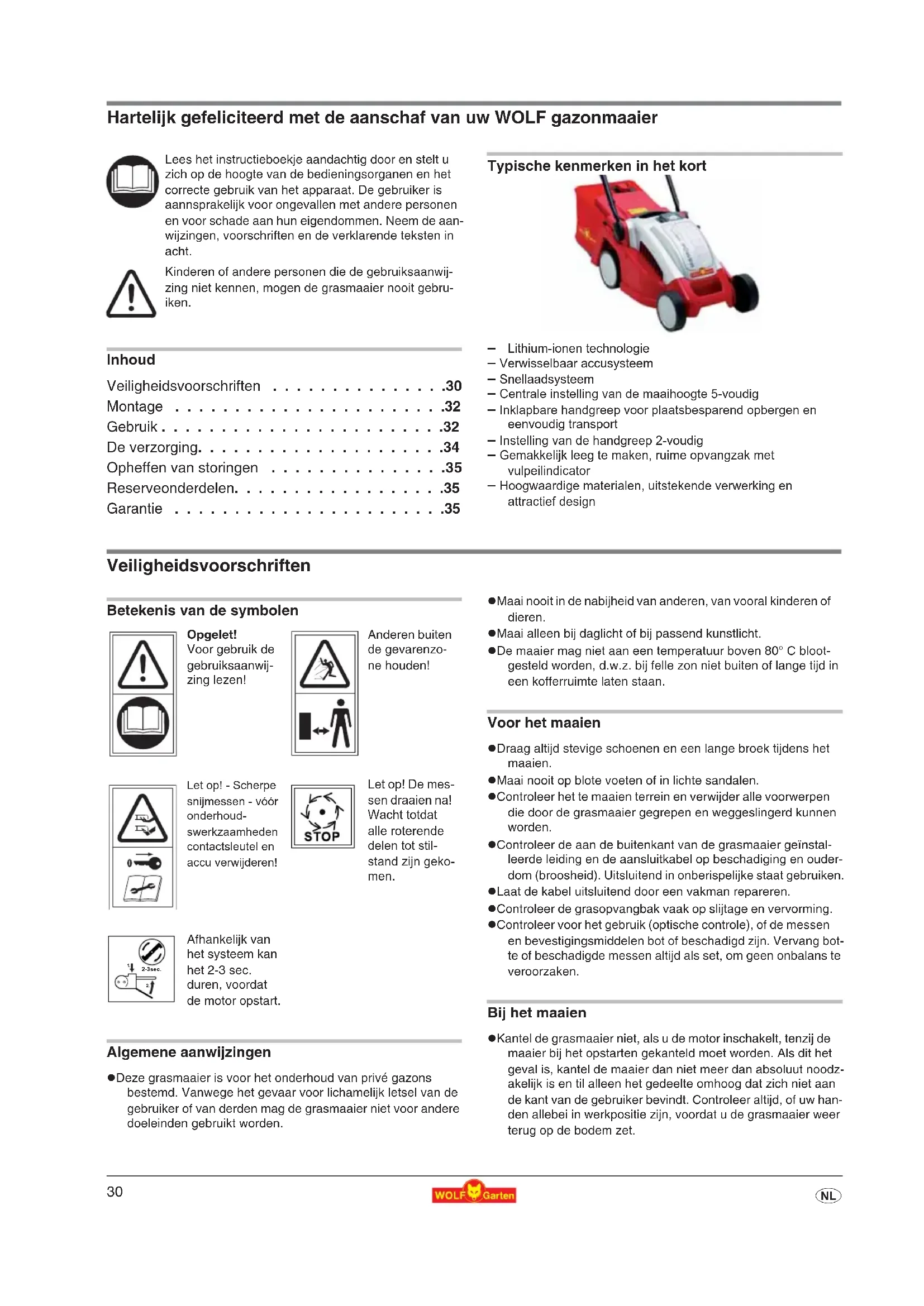 z Houdt de veiligheidsafstand aan die door de stang van de handgreep aangegeven is. z Zet de motor pas aan, als uw voeten zich op een veilige af- stand van de messen bevinden. z Let op een stabiele stand, vooral op een helling. Nooit snel, maar altijd rustig naar voren lopen. z Op hellende plaatsen maaien: – Maai altijd dwars op de helling, niet op- en neerwaarts – Wees zeer voorzichtig als u van richting verandert – Maai niet op steile hellingen z Wees zeer voorzichtig als u terugwaarts maait en de maaier naar u toe trekt. z Voorzichtig, grijp niet naar lopende snijkanten. z Ga niet voor de grasuitwerpopening staan. z Open de veiligheidsklep nooit als de motor nog loopt. z Rij nooit met een lopende motor over grind – steenslag! z Maai zo mogelijk niet in nat gras. z Onder de volgende omstandigheden moet het apparaat uitgeschakeld en de contactsleutel uitgetrokken worden en moet het apparaat tot stilstand gekomen zijn: – bij het achterlaten van de maaier – om een geblokkeerd mes vrij te maken – om de maaihoogte in te stellen – om de opvangzak leeg te maken – als een vreemd voorwerp geraakt werd (controleer dan eerst, of de maaier of de snijgereedschappen beschadigd zijn. Verhelp in dit geval dan eerst de beschadiging). – als de maaier door onbalans sterk vibreert (onmiddellijk uitschakelen en de oorzaak zoeken) – als de aansluitleiding tijdens het gebruik beschadigd wordt – om de maaier op te tillen of weg te dragen – om de maaier te kantelen of te transporteren (bijv. van-/ naar het gazon of over een weg) Het onderhoud 1 Opgelet! Roterend snijmes. Vóór al het onderhoud en schoonmaakwerk: z Contactsleutel en accu verwijderen. z Raak de draaiende messen niet aan. z Controleer regelmatig of alle zichtbare bevestigingsschroeven en moeren, vooral die van de messenbalk, goed vast zitten en draai ze zonodig aan. z Plaats de grasmaaier niet in vochtige ruimtes. z Vervang om veiligheidsredenen versleten of beschadigde delen. z Gebruik uitsluitend originele onderdelen van WOLF, anders heeft u geen garantie, dat uw grasmaaier voldoet aan de vei- ligheidsvoorschriften. Acculader z Deze oplader is alleen geschikt voor het opladen van de WOLF- Accu gazonmaaier LI-ION POWER 34. z Gebruik de oplader nooit in voochtige of natte omgeving, al- leen gebruiken in afgesloten ruimtes. z Trek de kabel er alleen uit door aan de stekker te trekken. Trekken aan kabel lan de kabel en de stekker beschadigen, waardoor de elektrische zekerheid niet meer gewaarborgd ios. z Gebruik nooit de acculader, warneer de kabel, stekker of het apparaat zelf beschadigd is. Breng de acculader naar de dichtstbijzijnde werksplaats. z Voorkom dat het koelingsmechanisme van het apparaat niet fuunctioneert door het ventilatiedeel af te dekken. Gebruik het apparaat niet in de buurt van warmtebronnen. z Open in geen geval de acculader. Breng deze bij een storing naar een erkende vakwerkplaats. z Gebruik uitsluitend originele onderdelen van WOLF, anders heeft u geen garantie, dat uw grasmaaier voldoet aan de vei- ligheidsvoorschriften. Batterie z Bij foutieve toepassing kan er vloeistof uit de accu komen. Vermijd contact daarmee. Bij toevallig contact afspoelen met water. Als de vloeistof in de ogen komt, roept u eveneens de hulp van een arts in. Naar buiten komende accuvloeistof kan tot huidirritaties of brandwonden leiden. z Bij het gebruik van een beschadigde accupack of bij ondes- kundig gebruik kunnen dampen uittreden. Zorg voor toevoer van frisse lucht en zoek een arts op, als klachten optreden. De dampen kunnen irritaties aan de ademhalingswegen veroorz- aken. 1 Brandgevaar! z Accu's nooit in de omgeving van zuren en licht ontvlambare materialen laden. z Accu uitsluitend bij een omgevingstemperatuur van 0 tot +40 °C laden. Na sterke belasting accu eerst laten afkoelen. 1 Explosiegevaar! Accu tegen hitte en vuur beschermen z Niet op radiatoren leggen of lang blootstellen aan sterk zonlicht. z Accu uitsluitend bij een omgevingstemperatuur tussen 0 °C t/m + 40 °C gebruiken. 1 Gevaar voor kortsluiting z Bij afvalverwijdering, transport of opslag van de accu moet de accu verpakt worden (plastic zak, doos) of moe- ten de contacten afgeplakt worden. z De accupack mag niet geopend worden. Accu‘s mileugerecht verwijderen z WOLF accu´s zijn Li-ION accumulatoren en moeten dus als afval worden verwijderd. De- fecte accu´s moeten door de vakhandel wor- den verwijderd. De accu´s moeten uit het toestel worden genomen, voordat het tot schroot wordt verwerkt. z WOLF accu´s zijn in technisch opzicht het meest geschikt om elektrische toestellen, die onafhankelijk van het stroomnet functioneren, van energie te voorzien. Li-ION-cellen zijn schadelijk voor het milieu, als ze samen met het gewone huisvuil als afval worden verwij- derd. z WOLF Garten wil het milieuvriendelijke ged- rag van de consumenten stimuleren. In sa- menwerking met u en de WOLF vakhandel garanderen wij de terugname en de opwer- king van afgewerkte accu‘s.32