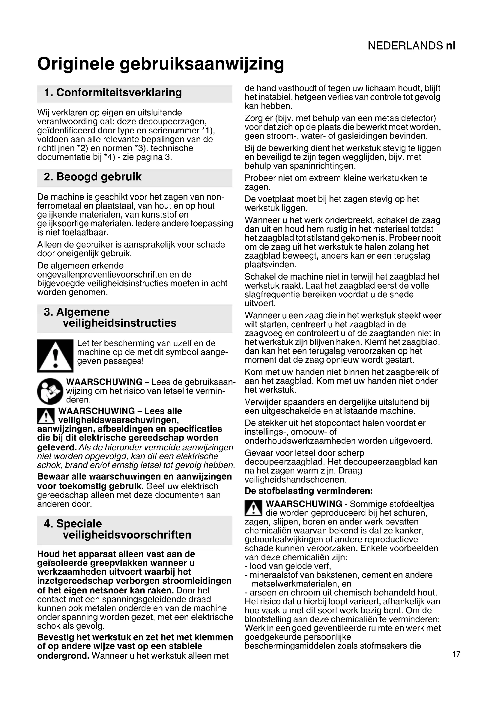 Originele gebruiksaanwijzing Wij verklaren op eigen en uitsluitende verantwoording dat: deze decoupeerzagen, geïdentificeerd door type en serienummer *1), voldoen aan alle relevante bepalingen van de richtlijnen *2) en normen *3). technische documentatie bij *4) - zie pagina 3. De machine is geschikt voor het zagen van non- ferrometaal en plaatstaal, van hout en op hout gelijkende materialen, van kunststof en gelijksoortige materialen. Iedere andere toepassing is niet toelaatbaar. Alleen de gebruiker is aansprakelijk voor schade door oneigenlijk gebruik. De algemeen erkende ongevallenpreventievoorschriften en de bijgevoegde veiligheidsinstructies moeten in acht worden genomen. Let ter bescherming van uzelf en de machine op de met dit symbool aange- geven passages! WAARSCHUWING – Lees de gebruiksaan- wijzing om het risico van letsel te vermin- deren. WAARSCHUWING – Lees alle veiligheidswaarschuwingen, aanwijzingen, afbeeldingen en specificaties die bij dit elektrische gereedschap worden geleverd. Als de hieronder vermelde aanwijzingen niet worden opgevolgd, kan dit een elektrische schok, brand en/of ernstig letsel tot gevolg hebben. Bewaar alle waarschuwingen en aanwijzingen voor toekomstig gebruik. Geef uw elektrisch gereedschap alleen met deze documenten aan anderen door. Houd het apparaat alleen vast aan de geïsoleerde greepvlakken wanneer u werkzaamheden uitvoert waarbij het inzetgereedschap verborgen stroomleidingen of het eigen netsnoer kan raken. Door het contact met een spanningsgeleidende draad kunnen ook metalen onderdelen van de machine onder spanning worden gezet, met een elektrische schok als gevolg. Bevestig het werkstuk en zet het met klemmen of op andere wijze vast op een stabiele ondergrond. Wanneer u het werkstuk alleen met de hand vasthoudt of tegen uw lichaam houdt, blijft het instabiel, hetgeen verlies van controle tot gevolg kan hebben. Zorg er (bijv. met behulp van een metaaldetector) voor dat zich op de plaats die bewerkt moet worden, geen stroom-, water- of gasleidingen bevinden. Bij de bewerking dient het werkstuk stevig te liggen en beveiligd te zijn tegen wegglijden, bijv. met behulp van spaninrichtingen. Probeer niet om extreem kleine werkstukken te zagen. De voetplaat moet bij het zagen stevig op het werkstuk liggen. Wanneer u het werk onderbreekt, schakel de zaag dan uit en houd hem rustig in het materiaal totdat het zaagblad tot stilstand gekomen is. Probeer nooit om de zaag uit het werkstuk te halen zolang het zaagblad beweegt, anders kan er een terugslag plaatsvinden. Schakel de machine niet in terwijl het zaagblad het werkstuk raakt. Laat het zaagblad eerst de volle slagfrequentie bereiken voordat u de snede uitvoert. Wanneer u een zaag die in het werkstuk steekt weer wilt starten, centreert u het zaagblad in de zaagvoeg en controleert u of de zaagtanden niet in het werkstuk zijn blijven haken. Klemt het zaagblad, dan kan het een terugslag veroorzaken op het moment dat de zaag opnieuw wordt gestart. Kom met uw handen niet binnen het zaagbereik of aan het zaagblad. Kom met uw handen niet onder het werkstuk. Verwijder spaanders en dergelijke uitsluitend bij een uitgeschakelde en stilstaande machine. De stekker uit het stopcontact halen voordat er instellings-, ombouw- of onderhoudswerkzaamheden worden uitgevoerd. Gevaar voor letsel door scherp decoupeerzaagblad. Het decoupeerzaagblad kan na het zagen warm zijn. Draag veiligheidshandschoenen. De stofbelasting verminderen: WAARSCHUWING - Sommige stofdeeltjes die worden geproduceerd bij het schuren, zagen, slijpen, boren en ander werk bevatten chemicaliën waarvan bekend is dat ze kanker, geboorteafwijkingen of andere reproductieve schade kunnen veroorzaken. Enkele voorbeelden van deze chemicaliën zijn: - lood van gelode verf, - mineraalstof van bakstenen, cement en andere metselwerkmaterialen, en - arseen en chroom uit chemisch behandeld hout. Het risico dat u hierbij loopt varieert, afhankelijk van hoe vaak u met dit soort werk bezig bent. Om de blootstelling aan deze chemicaliën te verminderen: Werk in een goed geventileerde ruimte en werk met goedgekeurde persoonlijke beschermingsmiddelen zoals stofmaskers die