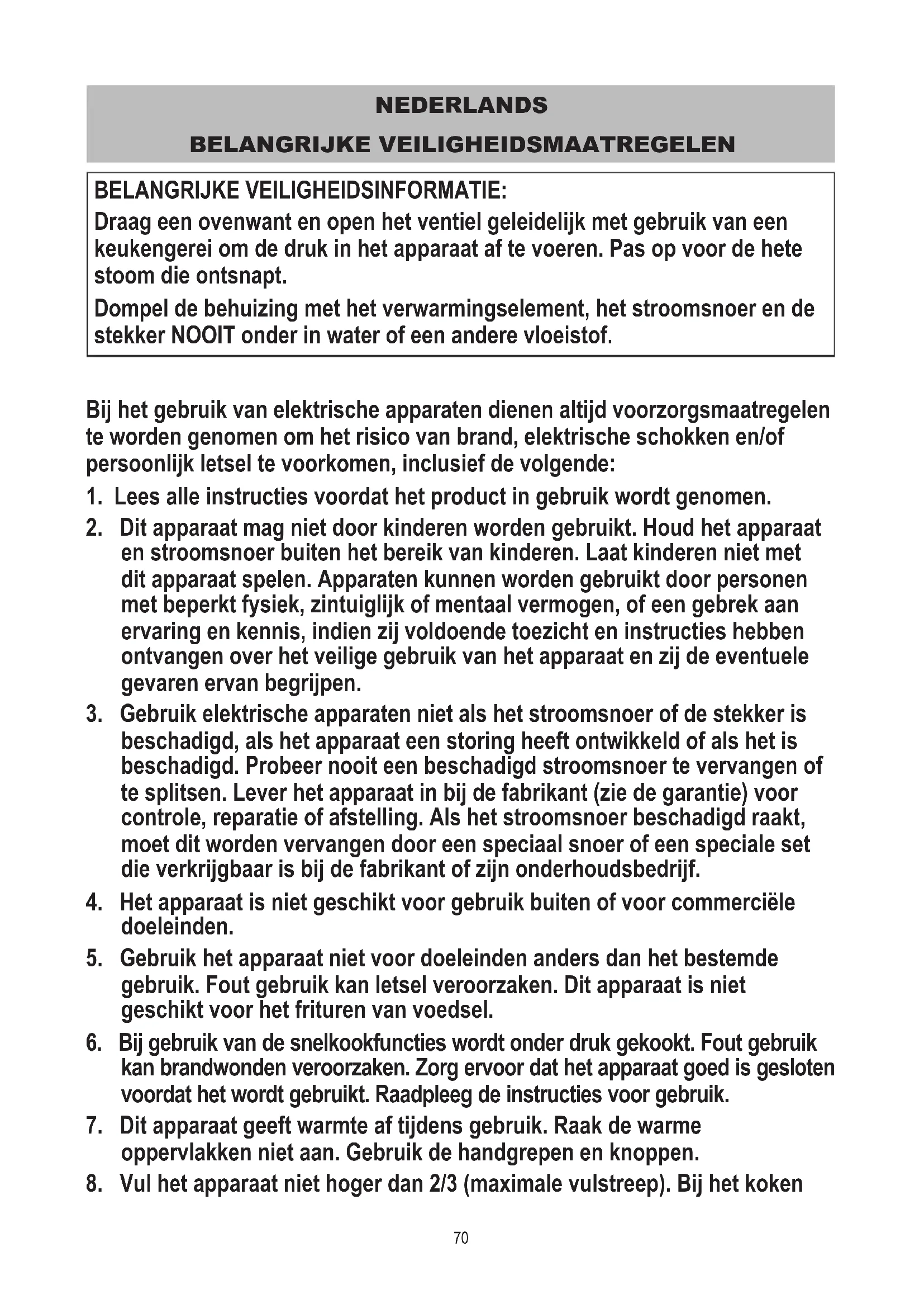 BELANGRIJKE VEILIGHEIDSINFORMATIE: Draag een ovenwant en open het ventiel geleidelijk met gebruik van een keukengerei om de druk in het apparaat af te voeren. Pas op voor de hete stoom die ontsnapt. Dompel de behuizing met het verwarmingselement, het stroomsnoer en de stekker NOOIT onder in water of een andere vloeistof.71 van voedingswaren die opzwellen, zoals rijst of gedroogde groente, mag u de pan niet meer dan halfvol (het aanbevolen niveau) maken. Wanneer de pan te hoog wordt gevuld, kan de ventilatiebuis verstopt raken waardoor overdruk ontstaat. Volg alle kook- en receptinstructies.