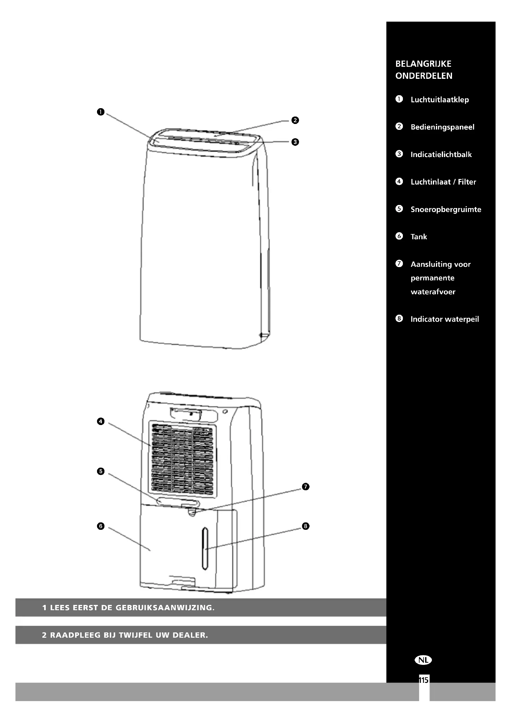 9154BELANGRIJKE ONDERDELEN Bedieningspaneel Uitlaat van droge lucht Uitneembaar waterreservoir Inlaat van vochtige lucht Luchtfilter Afvoertuit (ø 13 mm) met dop Zwenkwieltje Stekker en snoer Handvat