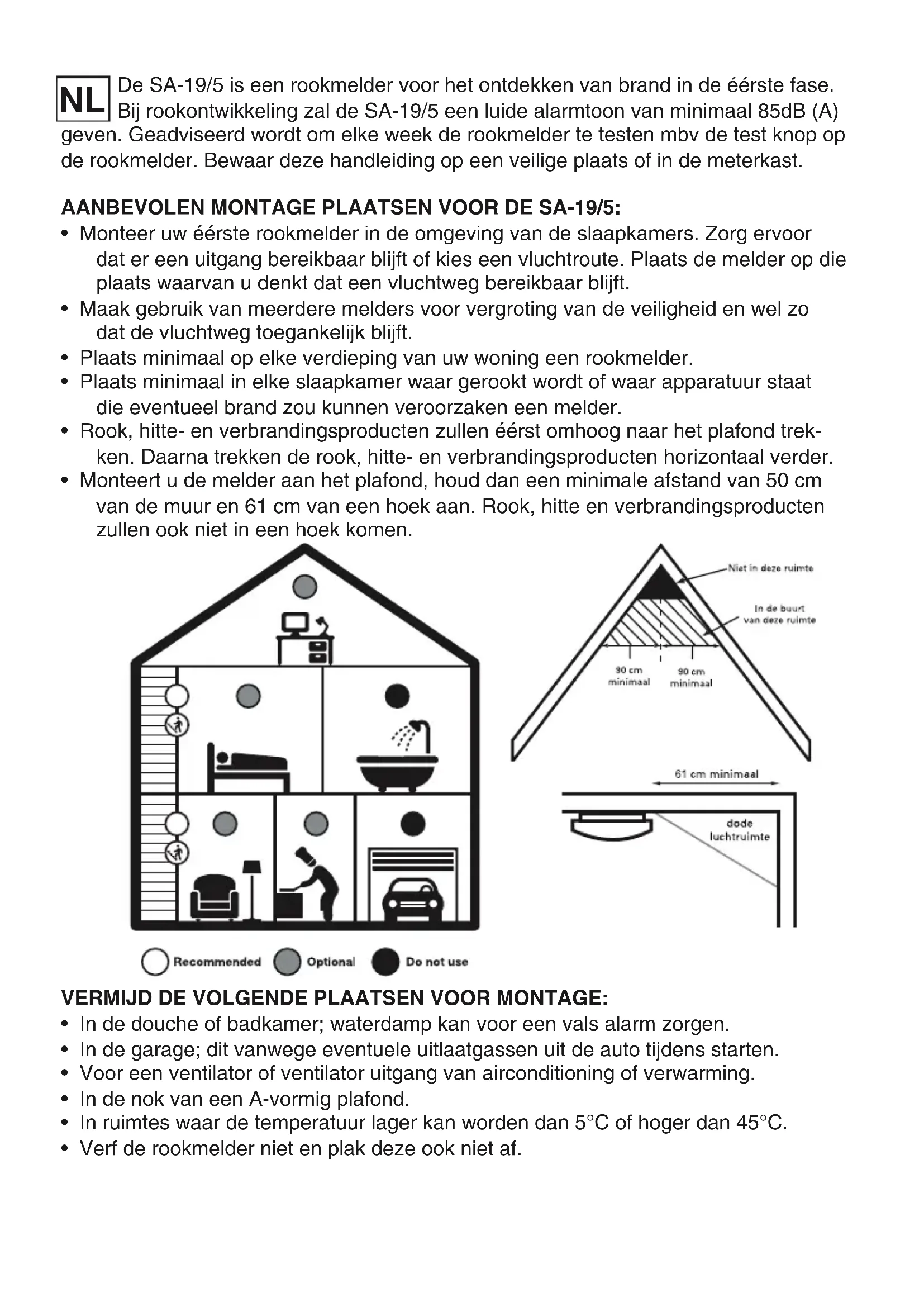 SA-19/5 Rookmelder voor gebruik in huiselijke omgeving Détecteur de fumée pour l’usage dans l’entourage domestique Rauchmelder zum Gebrauch im Heimbereich Smoke detector for domestic use Detector de humo para uso en el hogarDe SA-19/5 is een rookmelder voor het ontdekken van brand in de éérste fase. Bij rookontwikkeling zal de SA-19/5 een luide alarmtoon van minimaal 85dB (A) geven. Geadviseerd wordt om elke week de rookmelder te testen mbv de test knop op de rookmelder. Bewaar deze handleiding op een veilige plaats of in de meterkast. AANBEVOLEN MONTAGE PLAATSEN VOOR DE SA-19/5: