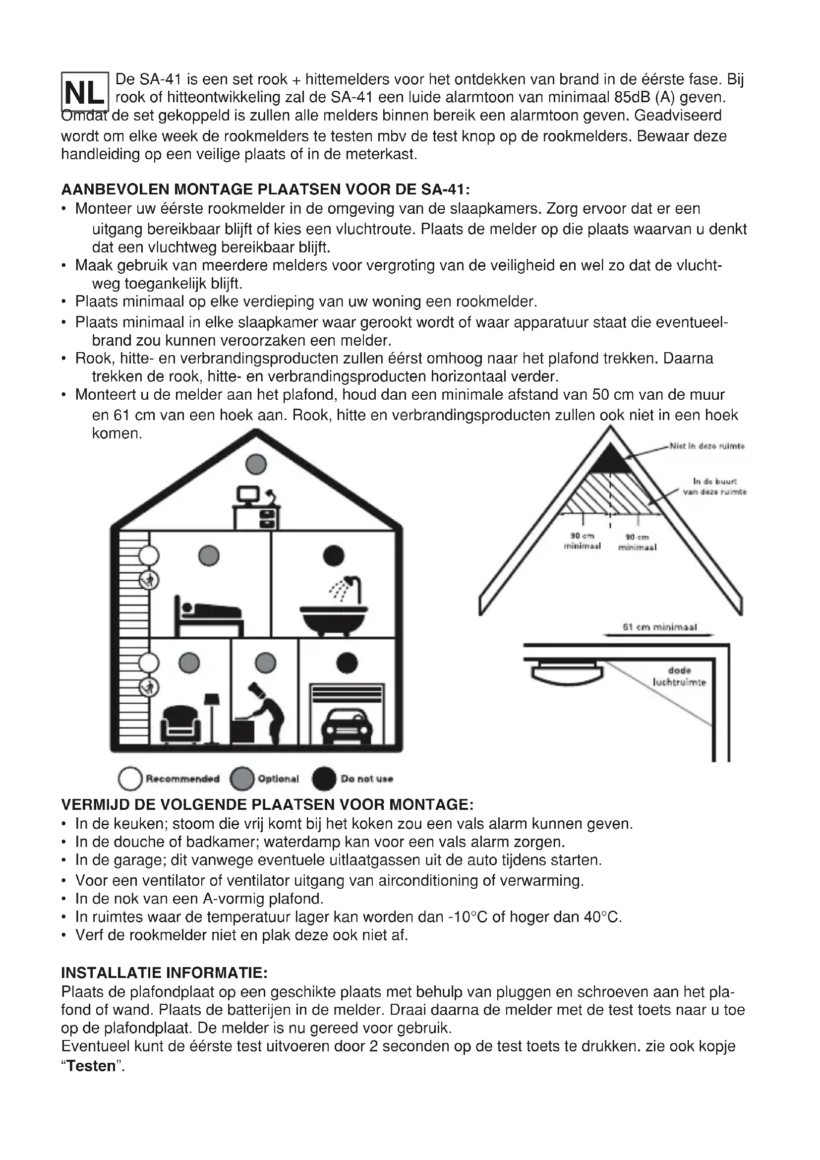 Holes of ceiling or wall Two screws (3*25mm) bracket plastic plugs Alarm body Diagram 3De SA-41 is een set rook + hittemelders voor het ontdekken van brand in de éérste fase. Bij rook of hitteontwikkeling zal de SA-41 een luide alarmtoon van minimaal 85dB (A) geven. Omdat de set gekoppeld is zullen alle melders binnen bereik een alarmtoon geven. Geadviseerd wordt om elke week de rookmelders te testen mbv de test knop op de rookmelders. Bewaar deze handleiding op een veilige plaats of in de meterkast. AANBEVOLEN MONTAGE PLAATSEN VOOR DE SA-41: