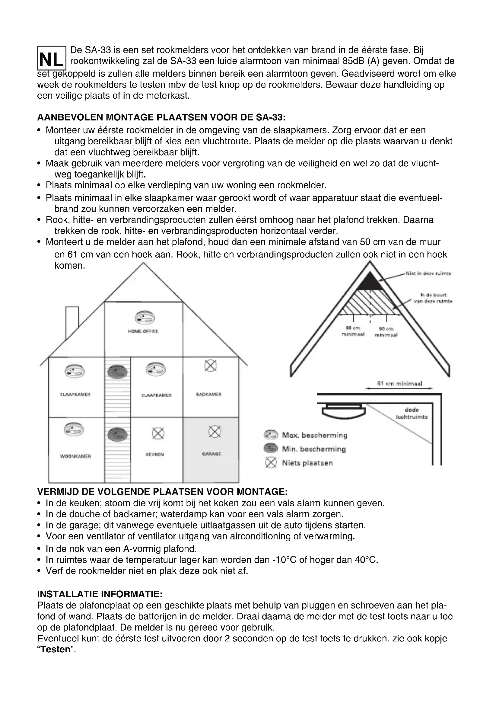 SA-33 Rookmelders voor gebruik in huiselijke omgeving Détecteur de fumée pour l’usage dans l’entourage domestique Rauchmelder zum Gebrauch im Heimbereich Detector de humo para uso en el hogar Interlinkable Brancher plusieurs Koppelbar EnlazadosDe SA-33 is een set rookmelders voor het ontdekken van brand in de éérste fase. Bij rookontwikkeling zal de SA-33 een luide alarmtoon van minimaal 85dB (A) geven. Omdat de set gekoppeld is zullen alle melders binnen bereik een alarmtoon geven. Geadviseerd wordt om elke week de rookmelders te testen mbv de test knop op de rookmelders. Bewaar deze handleiding op een veilige plaats of in de meterkast. AANBEVOLEN MONTAGE PLAATSEN VOOR DE SA-33: