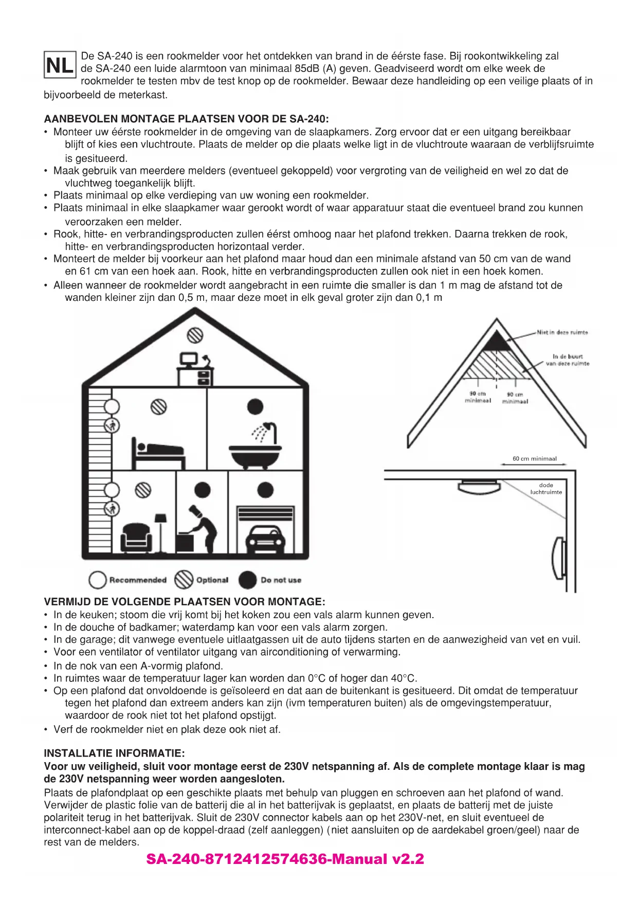 Rookmelder voor gebruik in huiselijke omgeving Détecteur de fumée pour l’usage dans l’entourage domestique Rauchmelder zum Gebrauch im Heimbereich Smoke detector for domestic use Detector de humo para uso en el hogarDe SA-240 is een rookmelder voor het ontdekken van brand in de éérste fase. Bij rookontwikkeling zal de SA-240 een luide alarmtoon van minimaal 85dB (A) geven. Geadviseerd wordt om elke week de rookmelder te testen mbv de test knop op de rookmelder. Bewaar deze handleiding op een veilige plaats of in bijvoorbeeld de meterkast. AANBEVOLEN MONTAGE PLAATSEN VOOR DE SA-240: