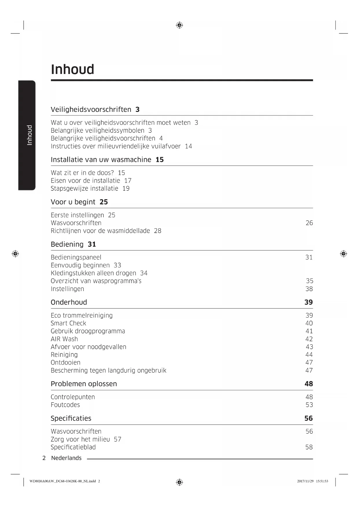 - De tweede keer drogen dient te gebeuren met 3 kg wasgoed (dit wasgoed bestaat uit: 1 lakens en 6 kussenslopen en 7 handdoeken) door het selecteren van Katoen drogen + Centrifugeren; (1 of 2 handdoeken kunnen worden toegevoegd of weggelaten om aan het juiste gewicht te komen.) WD80J6A00AW_DC68-03628K-00_NL.indd 62 2017/11/29 15:52:03Nederlands 63 Specicaties WD80J6A00AW_DC68-03628K-00_NL.indd 63 2017/11/29 15:52:03DC68-03628K-00 VRAGEN OF OPMERKINGEN?