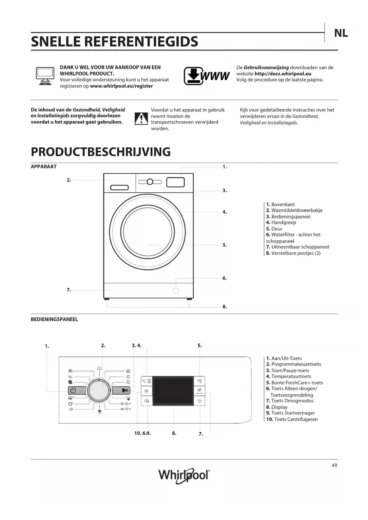 SNELLEREFERENTIEGIDS De inhoud van de Gezondheid, Veiligheid en Installatiegids zorgvuldig doorlezen voordat u het apparaat gaat gebruiken. Voordat u het apparaat in gebruik neemt moeten de transportschroeven verwijderd worden. Kijk voor gedetailleerde instructies over het verwijderen ervan in de Gezondheid, Veiligheid en Installatiegids. DANK U WEL VOOR UW AANKOOP VAN EEN WHIRLPOOL PRODUCT. Voor volledige ondersteuning kunt u het apparaat registeren op www.whirlpool.eu/register De Gebruiksaanwijzing downloaden van de website http://docs.whirlpool.eu Volg de procedure op de laatste pagina. WWW PRODUCTBESCHRIJVING BEDIENINGSPANEEL