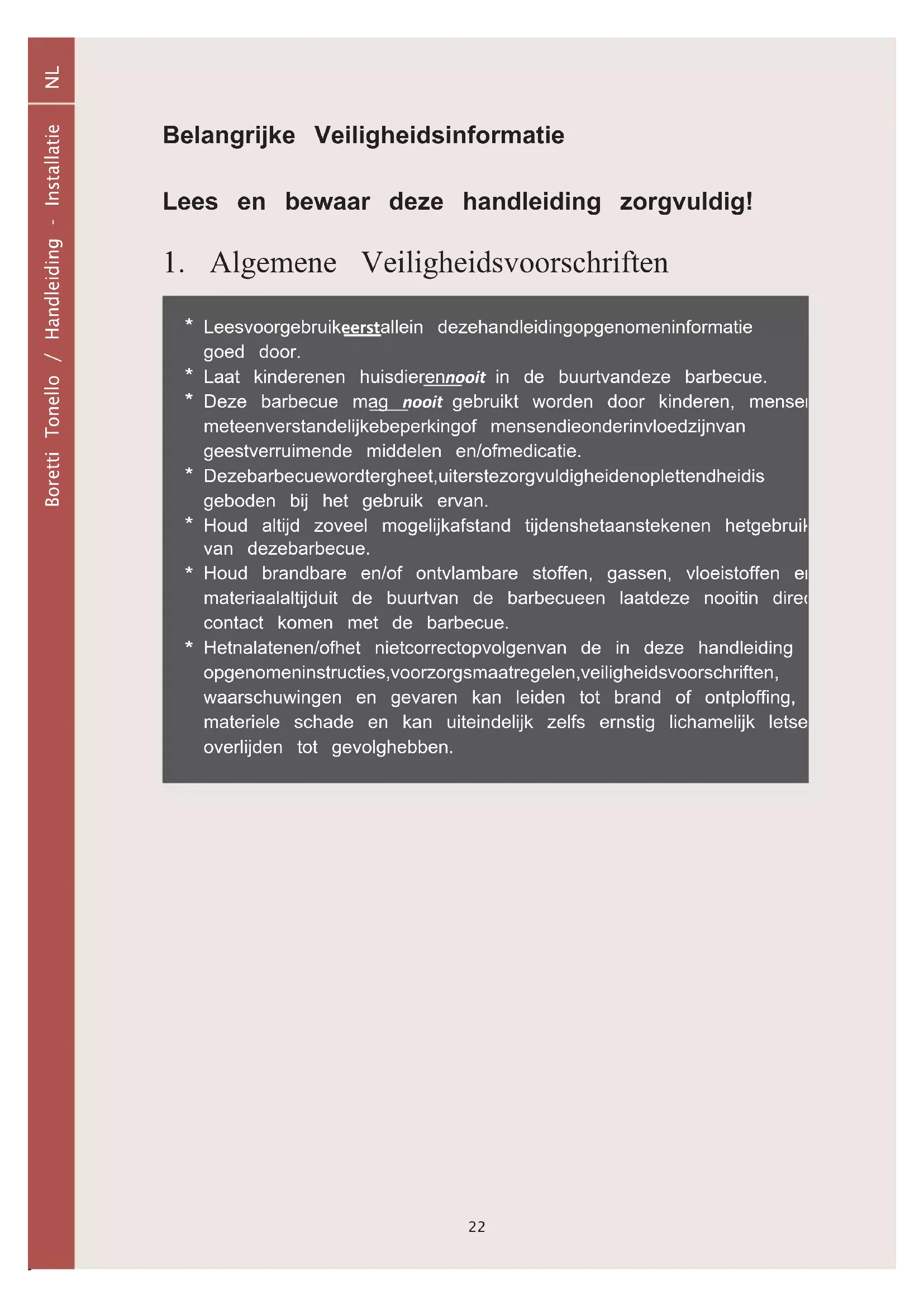 Boretti Tonello / User guide - Installation advice ENEN Boretti Tonello / User guide - Installation advice 18TONELLO NL | GEBRUIKSAANWIJZING www.boretti.comVoorwoord Gefeliciteerdmetde aankoopvan uw nieuwebarbecue.Wij zijnervanovertuigddat u, met uw passievoorbarbecueenen hetbuitenleven,een alledaagsezomeravond omtovert in eenprachtige buona sera en uw tuin in een giardino. Squadra Boretti Lees en bewaar deze handleiding zorgvuldig! Dezehandleidingbevatspecifiekeinstructiesvooruw veiligheid,voorhetmonteren, de bedieningen hetonderhoudvanuw barbecue.Gebruikde barbecueuitsluitend zoalsaangegevenin dezehandleiding.Gezondverstanden voorzichtigheidbijhet gebruik zijn een absolutemust!