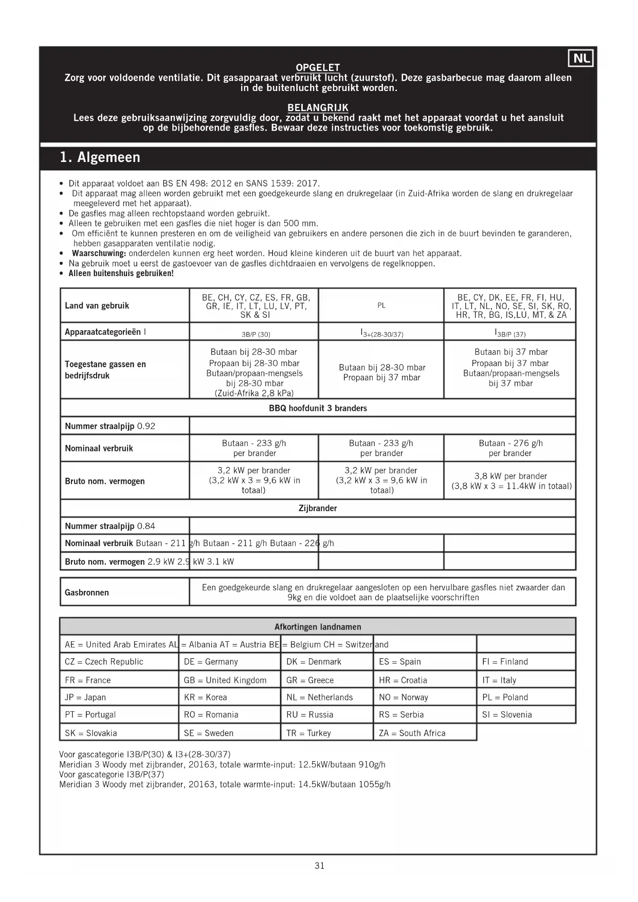 - Alleen buitenshuis gebruiken! Gasbronnen Een goedgekeurde slang en drukregelaar aangesloten op een hervulbare gases niet zwaarder dan 9kg en die voldoet aan de plaatselijke voorschriften Land van gebruik BE, CH, CY, CZ, ES, FR, GB, GR, IE, IT, LT, LU, LV, PT, SK & SI