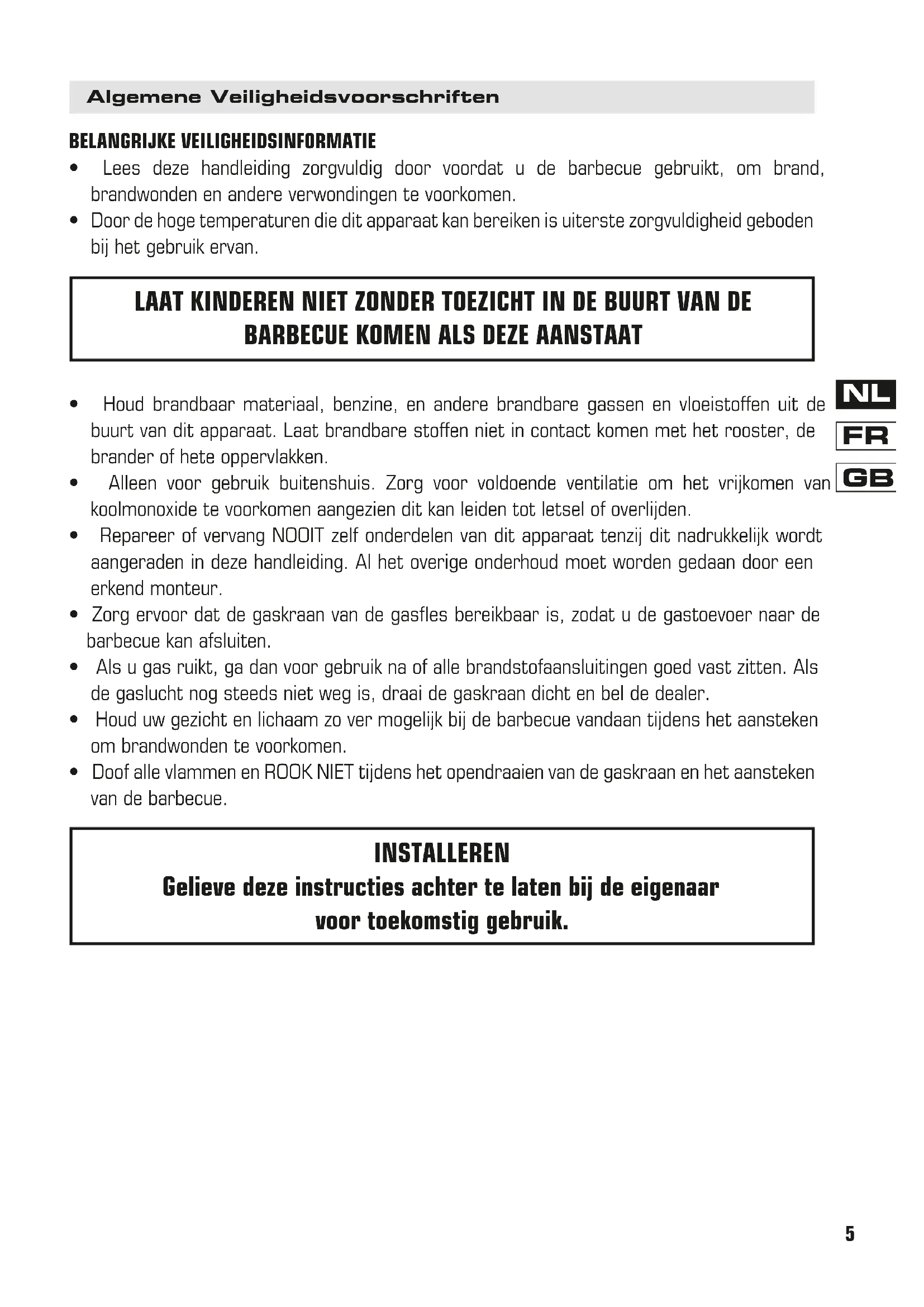 INSTALLEREN Gelieve deze instructies achter te laten bij de eigenaar voor toekomstig gebruik.6 Gebruik van de barbecue WAARSCHUWING PLAATSING BARBECUE Gebruik de barbecue NOOIT in garages, passages, schuurtjes of andere afgesloten ruimtes. Hierdoor kan koolmonoxide ontstaan, dat kan leiden tot letsel of overlijden. Plaats de barbecue op een vlak en horizontaal oppervlak. Verplaats de barbecue niet tijdens gebruik. N.B.: Bij zijwind kunnen de branders slechter branden. Voldoende ruimte openlaten bij ontvlambare objecten