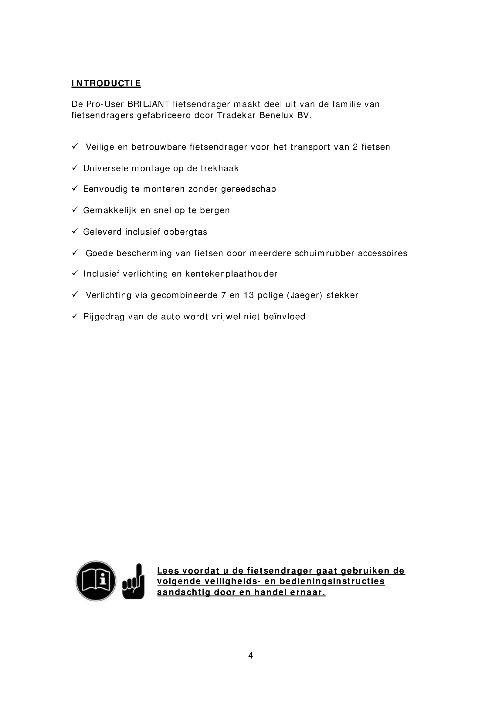 De stappen die worden genoemd en de veiligheidsinstructies voor montage, bediening en gebruik van de fietsendrager, moeten beslist worden opgevolgd. Al de kleinste afwijkingen kan leiden tot verkeerde montage of verkeerd gebruik.