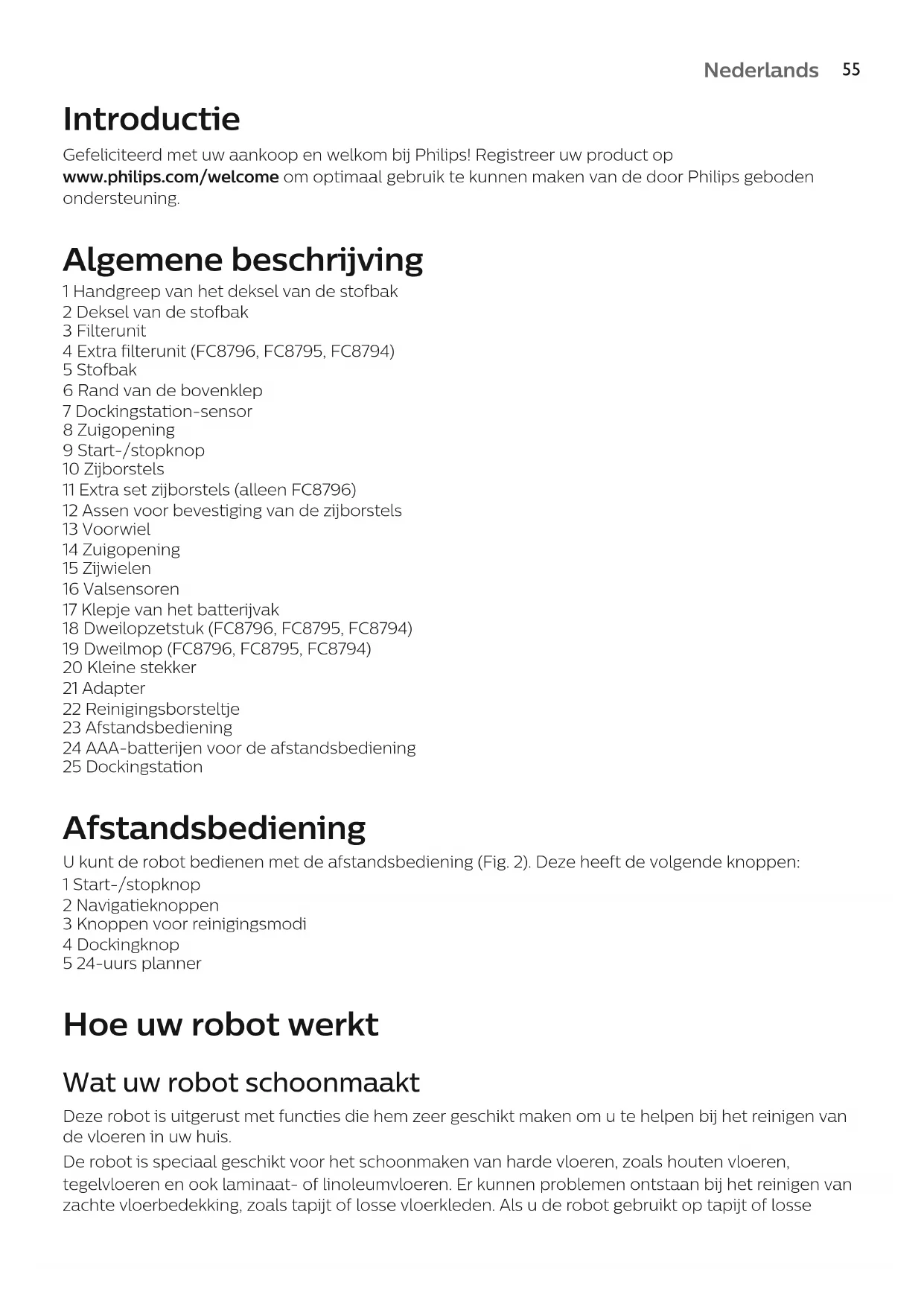 ItalianoNederlands Introductie Gefeliciteerd met uw aankoop en welkom bij Philips! Registreer uw product op www.philips.com/welcome om optimaal gebruik te kunnen maken van de door Philips geboden ondersteuning. Algemene beschrijving 1 Handgreep van het deksel van de stofbak 2 Deksel van de stofbak 3 Filterunit 4 Extra filterunit (FC8796, FC8795, FC8794) 5 Stofbak 6 Rand van de bovenklep 7 Dockingstation-sensor 8 Zuigopening 9 Start-/stopknop 10 Zijborstels 11 Extra set zijborstels (alleen FC8796) 12 Assen voor bevestiging van de zijborstels 13 Voorwiel 14 Zuigopening 15 Zijwielen 16 Valsensoren 17 Klepje van het batterijvak 18 Dweilopzetstuk (FC8796, FC8795, FC8794) 19 Dweilmop (FC8796, FC8795, FC8794) 20 Kleine stekker 21 Adapter 22 Reinigingsborsteltje 23 Afstandsbediening 24 AAA-batterijen voor de afstandsbediening 25 Dockingstation Afstandsbediening U kunt de robot bedienen met de afstandsbediening (Fig. 2). Deze heeft de volgende knoppen: 1 Start-/stopknop 2 Navigatieknoppen 3 Knoppen voor reinigingsmodi 4 Dockingknop 5 24-uurs planner Hoe uw robot werkt Wat uw robot schoonmaakt Deze robot is uitgerust met functies die hem zeer geschikt maken om u te helpen bij het reinigen van de vloeren in uw huis. De robot is speciaal geschikt voor het schoonmaken van harde vloeren, zoals houten vloeren, tegelvloeren en ook laminaat- of linoleumvloeren. Er kunnen problemen ontstaan bij het reinigen van zachte vloerbedekking, zoals tapijt of losse vloerkleden. Als u de robot gebruikt op tapijt of losse