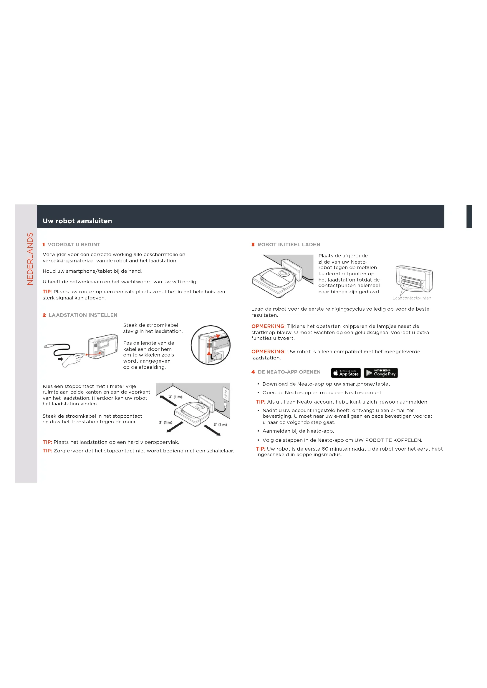 - Volg de stappen in de Neato-app om UW ROBOT TE KOPPELEN. TIP: Uw robot is de eerste 60 minuten nadat u de robot voor het eerst hebt ingeschakeld in koppelingsmodus. Kies een stopcontact met 1 meter vrije ruimteaan beide kanten en aan de voorkant van het laadstation. Hierdoor kan uw robot het laadstation vinden. Steek de stroomkabel in het stopcontact enduw het laadstation tegen de muur. TIP: Plaats het laadstation op een hard vloeroppervlak. TIP: Zorg ervoor dat het stopcontact niet wordt bediend met een schakelaar. Laadcontactpunten Uw robot aansluiten NEDERLANDSAls u niet in staat bent de robot te verbinden, moet u de koppelingsmodus van de robot opnieuw starten. Volg deze stappen: