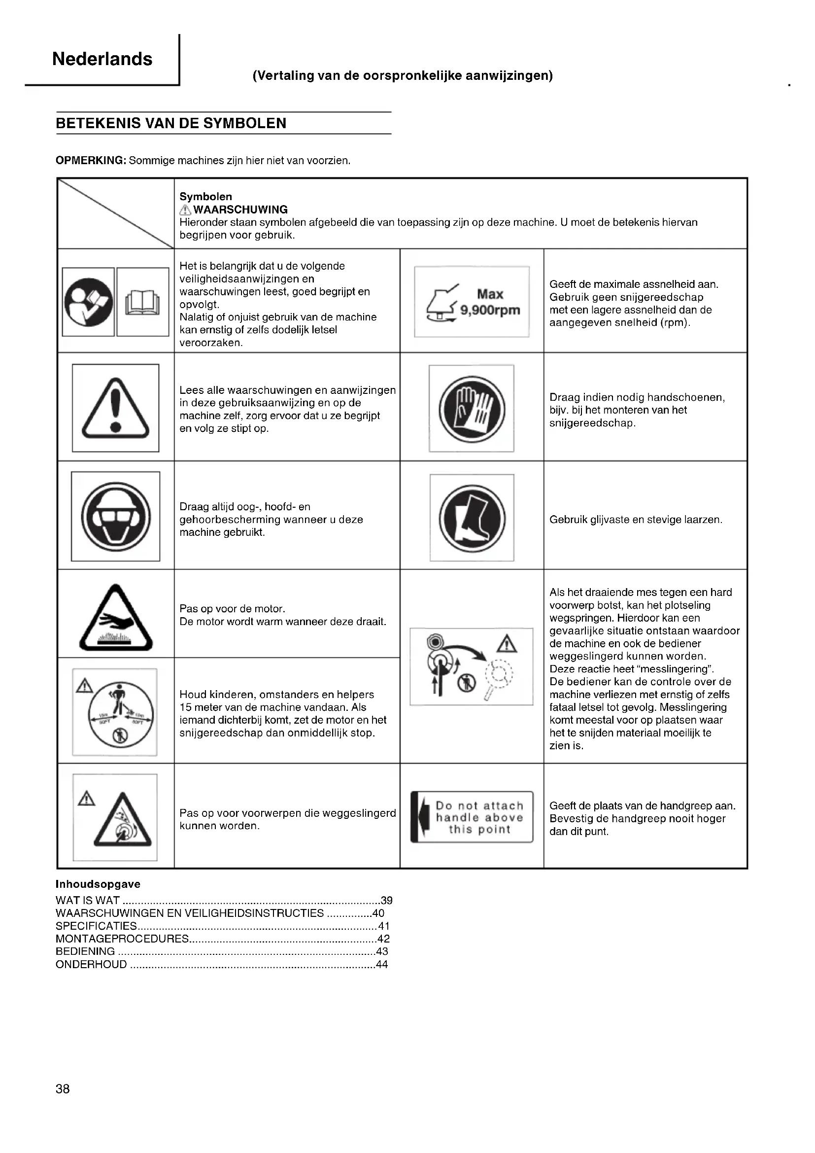 OPMERKING: Sommige machines zijn hier niet van voorzien. Symbolen WAARSCHUWING Hieronder staan symbolen afgebeeld die van toepassing zijn op deze machine. U moet de betekenis hiervan begrijpen voor gebruik. Het is belangrijk dat u de volgende veiligheidsaanwijzingen en waarschuwingen leest, goed begrijpt en opvolgt. Nalatig of onjuist gebruik van de machine kan ernstig of zelfs dodelijk letsel veroorzaken. Geeft de maximale assnelheid aan. Gebruik geen snijgereedschap met een lagere assnelheid dan de aangegeven snelheid (rpm). Lees alle waarschuwingen en aanwijzingen in deze gebruiksaanwijzing en op de machine zelf, zorg ervoor dat u ze begrijpt en volg ze stipt op. Draag indien nodig handschoenen, bijv. bij het monteren van het snijgereedschap. Draag altijd oog-, hoofd- en gehoorbescherming wanneer u deze machine gebruikt. Gebruik glijvaste en stevige laarzen. Pas op voor de motor. De motor wordt warm wanneer deze draait. Als het draaiende mes tegen een hard voorwerp botst, kan het plotseling wegspringen. Hierdoor kan een gevaarlijke situatie ontstaan waardoor de machine en ook de bediener weggeslingerd kunnen worden. Deze reactie heet “messlingering”. De bediener kan de controle over de machine verliezen met ernstig of zelfs fataal letsel tot gevolg. Messlingering komt meestal voor op plaatsen waar het te snijden materiaal moeilijk te zien is. Houd kinderen, omstanders en helpers 15 meter van de machine vandaan. Als iemand dichterbij komt, zet de motor en het snijgereedschap dan onmiddellijk stop. Pas op voor voorwerpen die weggeslingerd kunnen worden. Geeft de plaats van de handgreep aan. Bevestig de handgreep nooit hoger dan dit punt. Inhoudsopgave
