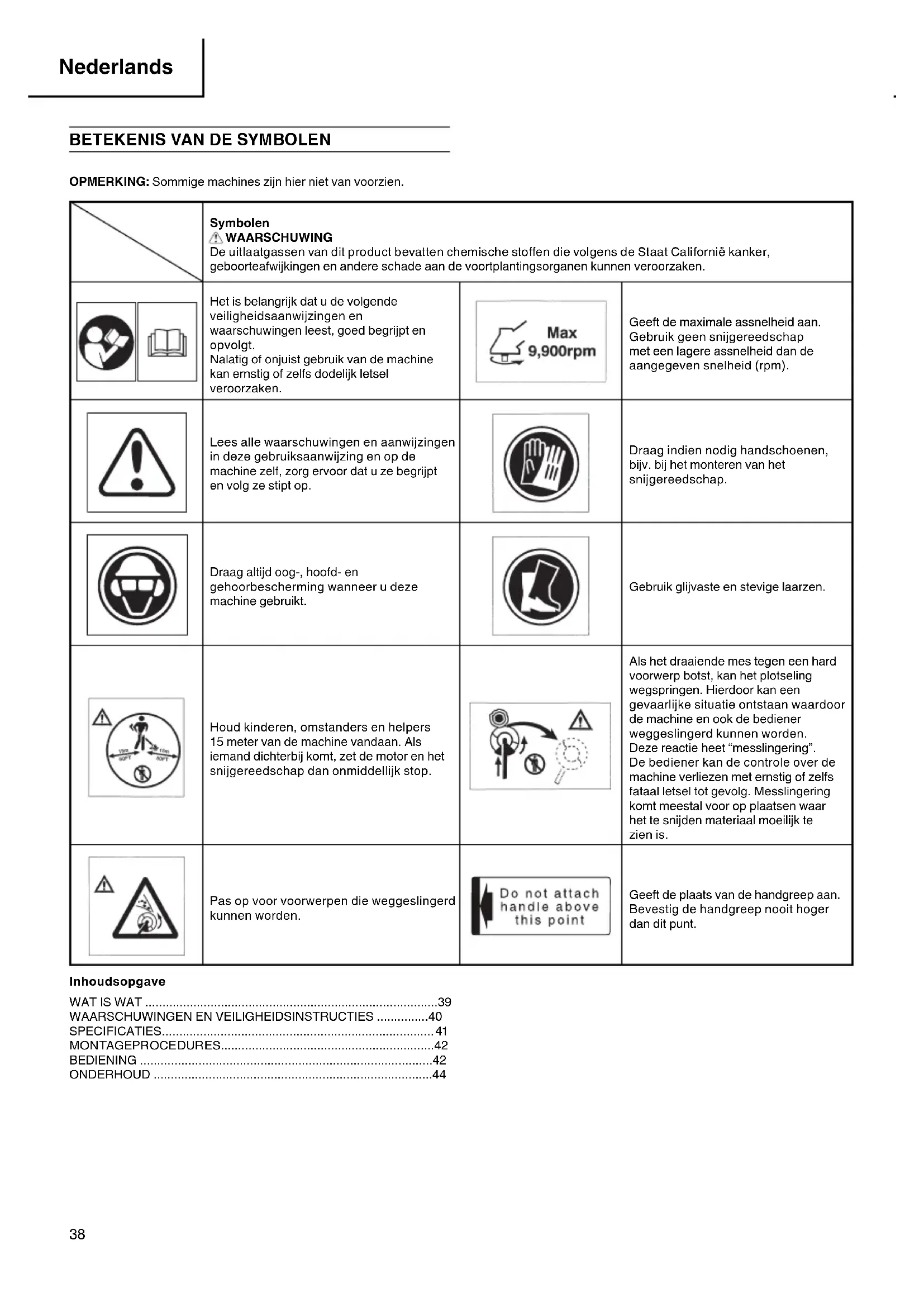OPMERKING: Sommige machines zijn hier niet van voorzien. Symbolen WAARSCHUWING De uitlaatgassen van dit product bevatten chemische stoff en die volgens de Staat Californië kanker, geboorteafwijkingen en andere schade aan de voortplantingsorganen kunnen veroorzaken. Het is belangrijk dat u de volgende veiligheidsaanwijzingen en waarschuwingen leest, goed begrijpt en opvolgt. Nalatig of onjuist gebruik van de machine kan ernstig of zelfs dodelijk letsel veroorzaken. Geeft de maximale assnelheid aan. Gebruik geen snijgereedschap met een lagere assnelheid dan de aangegeven snelheid (rpm). Lees alle waarschuwingen en aanwijzingen in deze gebruiksaanwijzing en op de machine zelf, zorg ervoor dat u ze begrijpt en volg ze stipt op. Draag indien nodig handschoenen, bijv. bij het monteren van het snijgereedschap. Draag altijd oog-, hoofd- en gehoorbescherming wanneer u deze machine gebruikt. Gebruik glijvaste en stevige laarzen. Houd kinderen, omstanders en helpers 15 meter van de machine vandaan. Als iemand dichterbij komt, zet de motor en het snijgereedschap dan onmiddellijk stop. Als het draaiende mes tegen een hard voorwerp botst, kan het plotseling wegspringen. Hierdoor kan een gevaarlijke situatie ontstaan waardoor de machine en ook de bediener weggeslingerd kunnen worden. Deze reactie heet “messlingering”. De bediener kan de controle over de machine verliezen met ernstig of zelfs fataal letsel tot gevolg. Messlingering komt meestal voor op plaatsen waar het te snijden materiaal moeilijk te zien is. Pas op voor voorwerpen die weggeslingerd kunnen worden. Geeft de plaats van de handgreep aan. Bevestig de handgreep nooit hoger dan dit punt. Inhoudsopgave