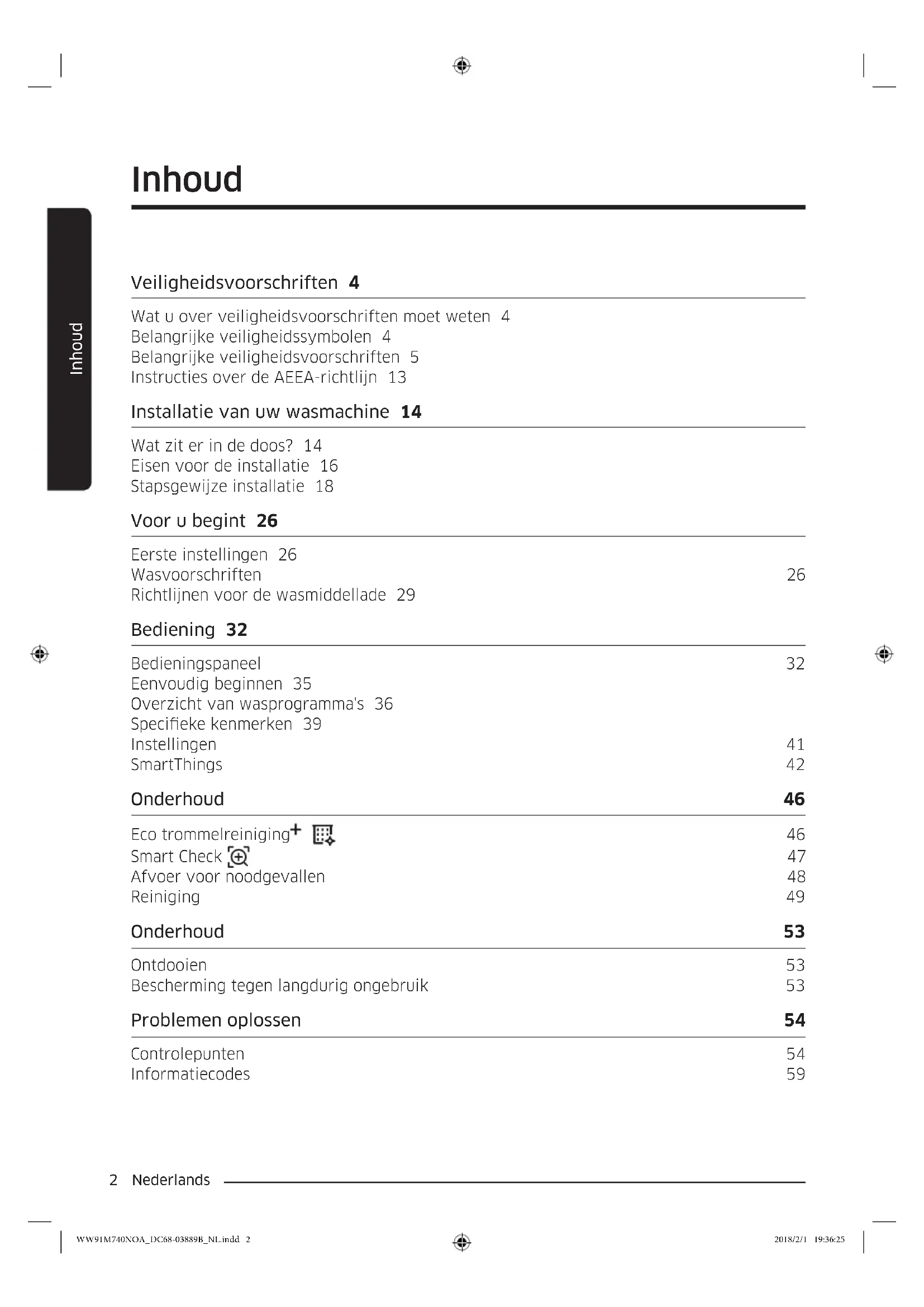 - Dit kan leiden tot een elektrische schok, brand of explosie. WW91M740NOA_DC68-03889B_NL.indd 8 2018/2/1 19:36:26Nederlands 9 Veiligheidsvoorschriften Open tijdens de wasgang, de deur van de wasmachine niet met geweld (hoge temperatuur bij het wassen/ drogen/centrifugeren).