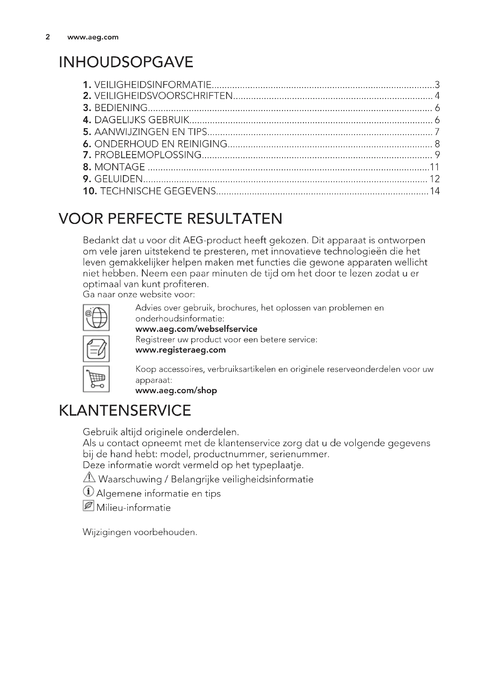 Bedankt dat u voor dit AEG-product heeft gekozen. Dit apparaat is ontworpen om vele jaren uitstekend te presteren, met innovatieve technologieën die het leven gemakkelijker helpen maken met functies die gewone apparaten wellicht niet hebben. Neem een paar minuten de tijd om het door te lezen zodat u er optimaal van kunt profiteren. Ga naar onze website voor: Advies over gebruik, brochures, het oplossen van problemen en onderhoudsinformatie: www.aeg.com/webselfservice Registreer uw product voor een betere service: www.registeraeg.com Koop accessoires, verbruiksartikelen en originele reserveonderdelen voor uw apparaat: www.aeg.com/shop KLANTENSERVICE Gebruik altijd originele onderdelen. Als u contact opneemt met de klantenservice zorg dat u de volgende gegevens bij de hand hebt: model, productnummer, serienummer. Deze informatie wordt vermeld op het typeplaatje. Waarschuwing / Belangrijke veiligheidsinformatie Algemene informatie en tips Milieu-informatie Wijzigingen voorbehouden. www.aeg.com