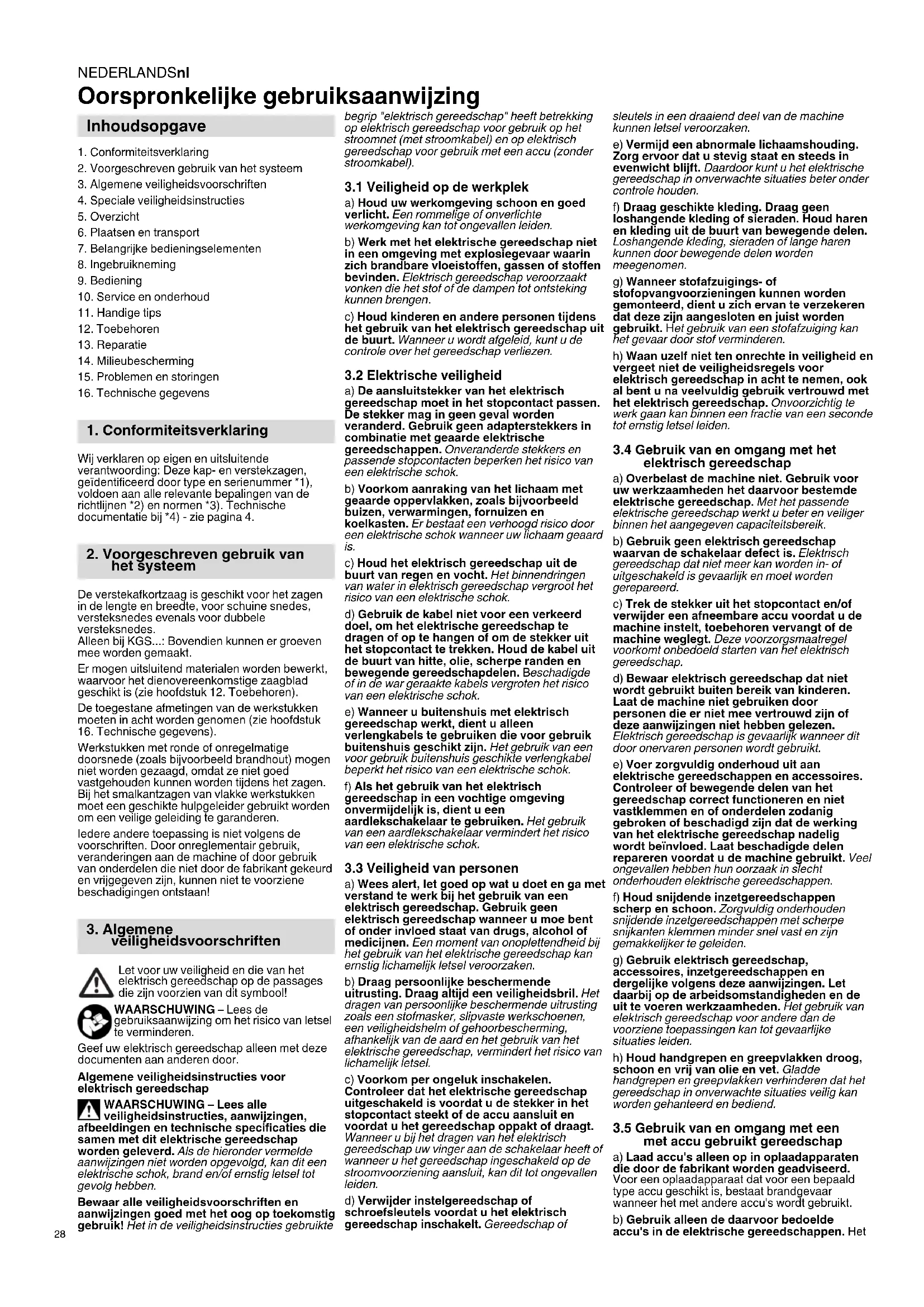 Rem het uitlopende zaagblad niet af door er aan de zijkant tegenaan te drukken. Alvorens de machine in te stellen, te repareren of er onderhoud aan te plegen dient u de stekker uit het stopcontact te halen of de accu te verwijderen. Als u het apparaat niet gebruikt, dient u de stekker uit het stopcontact te halen of de accu te verwijderen. Gevaar voor snijwonden ook bij stilstaand snijgereedschap! Draag veiligheidshandschoenen als u snijgereedschap moet vervangen. Bewaar de zaagbladen zo, dat niemand zich eraan kan verwonden. Gevaar voor terugslag van de zaagkop (zaagblad blijft in het werkstuk steken en de zaagkop slaat plotseling omhoog)! Kies een voor het te snijden materiaal geschikt zaagblad. Houd de handgreep goed vast. Op het moment waarop het zaagblad insteekt in het werkstuk is het risico op terugslag bijzonder groot. Gebruik voor het zagen van dunne werkstukken of werkstukken met dunne wanden uitsluitend zaagbladen met fijne vertanding. Zorg ervoor dat de zaagbladen steeds scherp zijn. Botte zaagbladen moeten onmiddellijk vervangen worden. Er bestaat een verhoogd risico op terugslag als een botte zaagtand in het oppervlak van het werkstuk vast blijft zitten. Zet het werkstuk nooit op z’n smalle kant (tijdens het schaven). Controleer in geval van twijfel de werkstukken op vreemde voorwerpen (bijvoorbeeld nagels of schroeven). Zaag nooit verschillende stukken, ook geen bundels met verschillende stukken, tegelijk. Er is gevaar voor lichamelijk letsel als aparte stukken zonder steun door het zaagblad worden gegrepen. Alleen bij KGS...: Vermijd bij het maken van groeven zijdelingse druk op het zaagblad – gebruik een spaninrichting. Klemgevaar! Zorg ervoor dat tijdens het gebruik geen lichaamsdelen of kleding door roterende onderdelen gegrepen en meegetrokken kunnen worden (geen stropdassen, geen handschoenen, geen kleding met wijde mouwen dragen; bij lang haar moet absoluut een haarnet worden gedragen). Zaag nooit werkstukken waaraan touwen, snoeren, banden, kabels of draden hangen of die dergelijke materialen bevatten. Gevaar door onvoldoende persoonlijke beschermingsmiddelen! Draag oordoppen. Draag een veiligheidsbril. Draag een stofmasker. Draag aangepaste werkkledij. Draag slipbestendig schoeisel. Draag de handschoenen bij de omgang met zaagbladen en ruwe werkstukken. Draag de zaagbladen in een container. Gevaar door houtstof! Werk uitsluitend met aangesloten afzuiginstallatie. De afzuiginstallatie moet voldoen aan de in hoofdstuk 16. genoemde waarden. De stofbelasting verminderen: Deeltjes die tijdens het werken met deze machine ontstaan, kunnen stoffen bevatten die kanker, allergische reacties, aandoeningen aan de luchtwegen, aangeboren afwijkingen of andere voortplantingsproblemen veroorzaken. Enkele voorbeelden van dergelijke stoffen zijn: lood (in loodhoudende verf), additieven voor de behandeling van hout (chromaat, houtverduurzamingsmiddelen), enkele houtsoorten (zoals eiken- of beukenstof). Het risico is afhankelijk van het feit hoe lang de gebruiker of omstanders aan de stofbelasting worden blootgesteld. Deze stofdeeltjes mogen niet in het lichaam terechtkomen. Om de belasting met deze stoffen te verminderen: zorg voor een goede ventilatie van de werkplek en draag geschikte beschermingsmiddelen, zoals bijv. ademmaskers die in staat zijn om de microscopisch kleine stofdeeltjes uit de lucht te filteren. Neem de voor uw materiaal, personeel, toepassingsgeval en locatie geldende richtlijnen in acht (bijv. arbeidsveiligheidsbepalingen, afvalbehandeling). Verzamel de ontstane deeltjes op de plaats waar deze ontstaan; voorkom dat deze neerslaan in de omgeving. Gebruik de meegeleverde stofopvanginrichting en een geschikte stofafzuiging. Daardoor komen slechts weinig deeltjes ongecontroleerd in de omgeving terecht. Verminder de stofbelasting door: – de vrijkomende deeltjes en de afvoerluchtstroom van de machine niet op de gebruiker zelf of omstanders of op neergeslagen stof te richten, – een afzuiginstallatie en/of een luchtfilter te gebruiken, – de werkplek goed te ventileren en schoon te houden door te stofzuigen. Vegen of blazen wervelt het stof op. – Zuig of was de beschermende kleding. Niet uitblazen, uitslaan of uitborstelen. Gevaar door technische wijzigingen of het gebruik van onderdelen die niet door de fabrikant zijn goedgekeurd en vrijgegeven Monteer dit toestel zoals in de handleiding wordt aangegeven. Gebruik hiervoor uitsluitend door de fabrikant vrijgegeven onderdelen. Dit betreft in het bijzonder: – zaagbladen (bestelnummers zie hoofdstuk 12. Toebehoren). – Veiligheidsvoorzieningen. – Weergave van de zaaglijn Breng aan deze onderdelen geen wijzigingen aan. Let erop dat het op het zaagblad aangegeven max. toerental tenminste net zo hoog is als het toerental dat op de zaag wordt vermeld. Gevaar door gebreken aan het apparaat! Controleer het apparaat voor het inschakelen telkens op eventuele beschadigingen: voor elk gebruik moet de goede werking van de veiligheidsinrichtingen en van licht beschadigde onderdelen zorgvuldig gecontroleerd worden. Controleer of de scharnierende onderdelen correct functioneren en niet klemmen. Alle onderdelen dienen juist gemonteerd te zijn en te voldoen aan alle voorwaarden om een goede werking van het apparaat te garanderen. Gebruik geen beschadigde of vervormde zaagbladen. Gevaar door lawaai! Draag oordoppen. Gevaar door blokkerende werkstukken of werkstukdelen! Als er een blokkering optreedt: