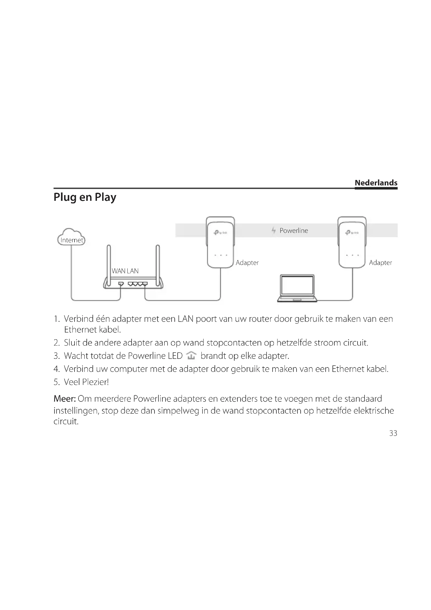 Meer: Om meerdere Powerline adapters en extenders toe te voegen met de standaard instellingen, stop deze dan simpelweg in de wand stopcontacten op hetzelfde elektrische circuit. Internet WAN LAN Adapter Adapter PowerlineNederlands