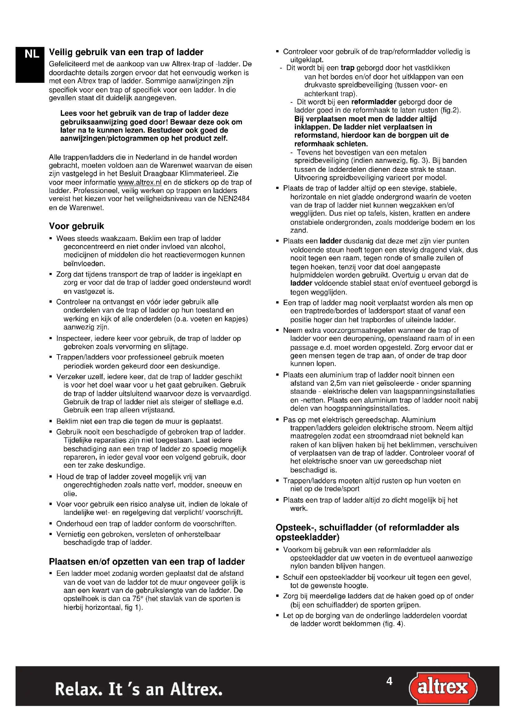 Veilig gebruik van een trap of ladder Gefeliciteerd met de aankoop van uw Altrex-trap of -ladder. De doordachte details zorgen ervoor dat het eenvoudig werken is met een Altrex trap of ladder. Sommige aanwijzingen zijn specifiek voor een trap of specifiek voor een ladder. In die gevallen staat dit duidelijk aangegeven. Lees voor het gebruik van de trap of ladder deze gebruiksaanwijzing goed door! Bewaar deze ook om later na te kunnen lezen. Bestudeer ook goed de aanwijzingen/pictogrammen op het product zelf. Alle trappen/ladders die in Nederland in de handel worden gebracht, moeten voldoen aan de Warenwet waarvan de eisen zijn vastgelegd in het Besluit Draagbaar Klimmaterieel. Zie voor meer informatie www.altrex.nl en de stickers op de trap of ladder. Professioneel, veilig werken op trappen en ladders vereist het kiezen voor het veiligheidsniveau van de NEN2484 en de Warenwet. Voor gebruik Wees steeds waakzaam. Beklim een trap of ladder geconcentreerd en niet onder invloed van alcohol, medicijnen of middelen die het reactievermogen kunnen beïnvloeden. Zorg dat tijdens transport de trap of ladder is ingeklapt en zorg er voor dat de trap of ladder goed ondersteund wordt en vastgezet is. Controleer na ontvangst en vóór ieder gebruik alle onderdelen van de trap of ladder op hun toestand en werking en kijk of alle onderdelen (o.a. voeten en kapjes) aanwezig zijn. Inspecteer, iedere keer voor gebruik, de trap of ladder op gebreken zoals vervorming en slijtage. Trappen/ladders voor professioneel gebruik moeten periodiek worden gekeurd door een deskundige. Verzeker uzelf, iedere keer, dat de trap of ladder geschikt is voor het doel waar voor u het gaat gebruiken. Gebruik de trap of ladder uitsluitend waarvoor deze is vervaardigd. Gebruik de trap of ladder niet als steiger of stellage e.d. Gebruik een trap alleen vrijstaand. Beklim niet een trap die tegen de muur is geplaatst. Gebruik nooit een beschadigde of gebroken trap of ladder. Tijdelijke reparaties zijn niet toegestaan. Laat iedere beschadiging aan een trap of ladder zo spoedig mogelijk repareren, in ieder geval voor een volgend gebruik, door een ter zake deskundige. Houd de trap of ladder zoveel mogelijk vrij van ongerechtigheden zoals natte verf, modder, sneeuw en olie. Voer voor gebruik een risico analyse uit, indien de lokale of landelijke wet- en regelgeving dat verplicht/ voorschrijft. Onderhoud een trap of ladder conform de voorschriften. Vernietig een gebroken, versleten of onherstelbaar beschadigde trap of ladder. Plaatsen en/of opzetten van een trap of ladder Een ladder moet zodanig worden geplaatst dat de afstand van de voet van de ladder tot de muur ongeveer gelijk is aan een kwart van de gebruikslengte van de ladder. De opstelhoek is dan ca 75° (het stavlak van de sporten is hierbij horizontaal, fig 1).