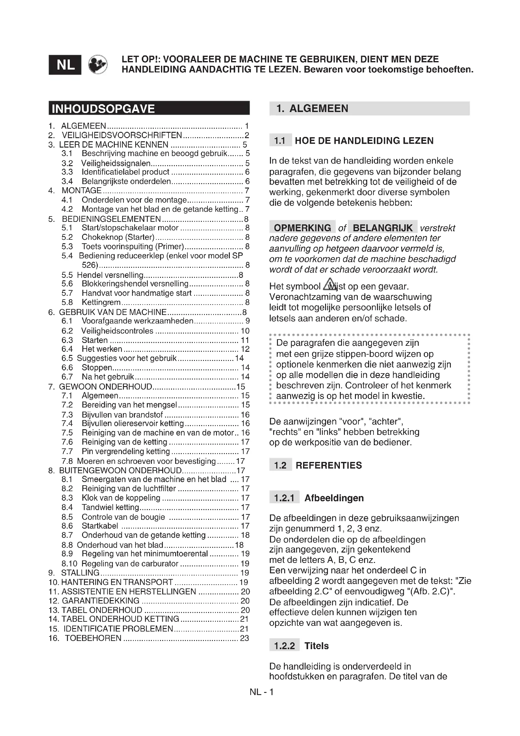 De "Tabel voor de correcte combinatie van blad en ketting" bevat de lijst met alle mogelijke combinaties tussen staaf en ketting, met vermelding van diegene die op elke machine gebruikt kunnen worden, aangegeven met het symbool "". Dezelfde tabel verschaft bovendien de kenmerken van de gehomologeerde kettingen en staven voor iedere machine. Gebruik voor de wisselstukken enkel de bladen en kettingen die in de tabel zijn aangegeven. Het gebruik van niet goedgekeurde combinaties kan leiden tot ernstige persoonlijke letsels en schade aan de machine. Daar de gebruiker naar eigen oordeel besluit welke blad en ketting onder de verschillende gebruiksomstandigheden te kiezen, toe te passen en te gebruiken, neemt hij dan ook zelf de daaruit voortkomende verantwoording op zich voor iedere willekeurige schade die daardoor veroorzaakt wordt. In geval van twijfel of geringe kennis van de speciciteit van iedere blad of ketting, moet u contact opnemen met uw eigen verkoper of met een gespecialiseerd tuincentrum.NO - 1