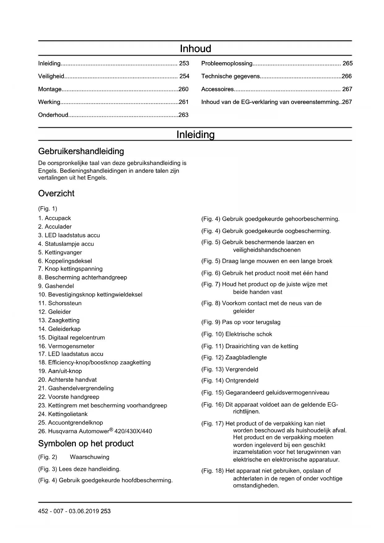 420/430X/440 Symbolen op het product (Fig. 2) Waarschuwing (Fig. 3) Lees deze handleiding. (Fig. 4) Gebruik goedgekeurde hoofdbescherming. (Fig. 4) Gebruik goedgekeurde gehoorbescherming. (Fig. 4) Gebruik goedgekeurde oogbescherming. (Fig. 5) Gebruik beschermende laarzen en veiligheidshandschoenen (Fig. 5) Draag lange mouwen en een lange broek (Fig. 6) Gebruik het product nooit met één hand (Fig. 7) Houd het product op de juiste wijze met beide handen vast (Fig. 8) Voorkom contact met de neus van de geleider (Fig. 9) Pas op voor terugslag (Fig. 10) Elektrische schok (Fig. 11) Draairichting van de ketting (Fig. 12) Zaagbladlengte (Fig. 13) Vergrendeld (Fig. 14) Ontgrendeld (Fig. 15) Gegarandeerd geluidsvermogenniveau (Fig. 16) Dit apparaat voldoet aan de geldende EG- richtlijnen. (Fig. 17) Het product of de verpakking kan niet worden beschouwd als huishoudelijk afval. Het product en de verpakking moeten worden ingeleverd bij een geschikt inzamelstation voor het terugwinnen van elektrische en elektronische apparatuur. (Fig. 18) Het apparaat niet gebruiken, opslaan of achterlaten in de regen of onder vochtige omstandigheden.