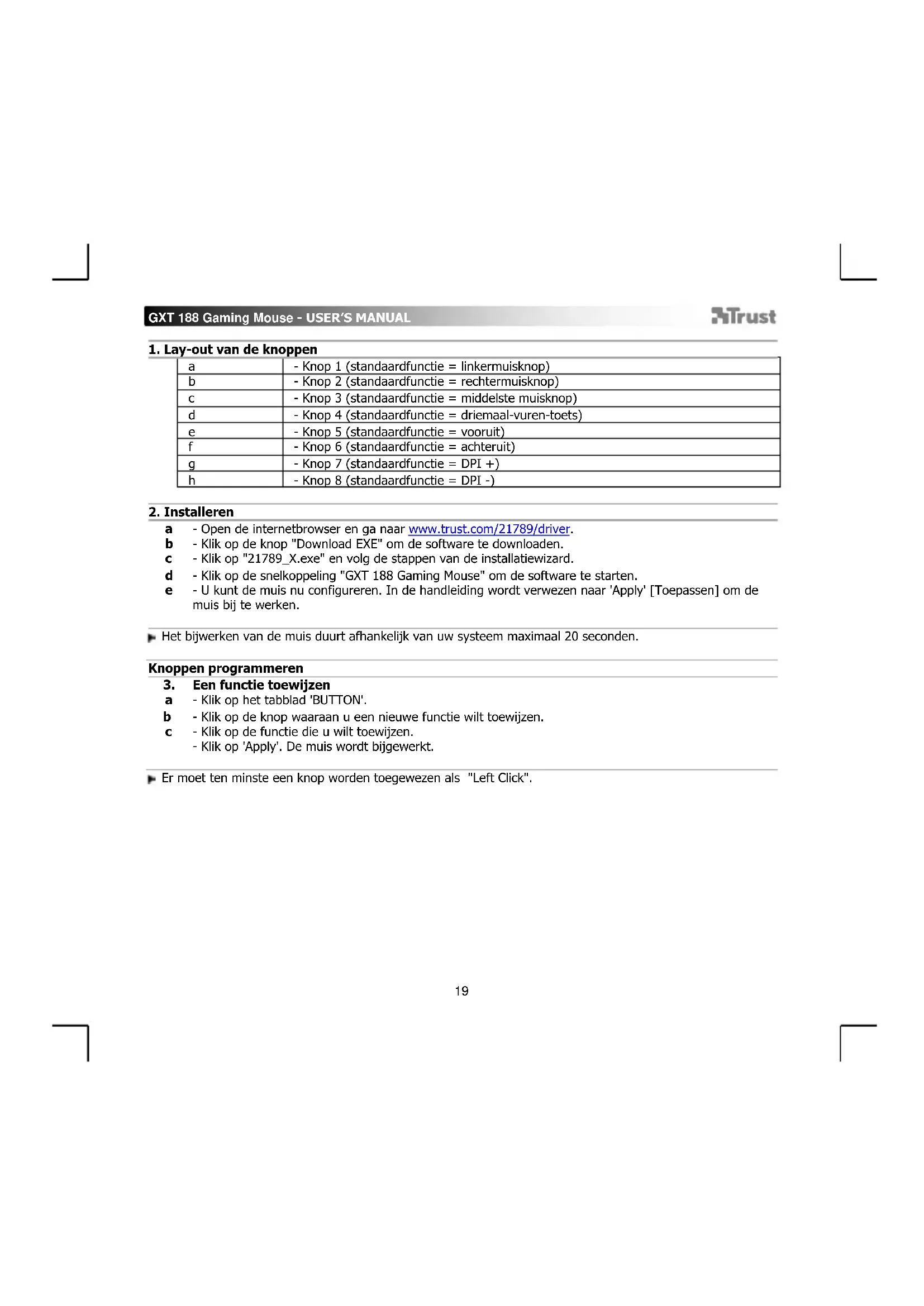 - Open de internetbrowser en ga naar www.trust.com/21789/driver. - Klik op de knop "Download EXE" om de software te downloaden. - Klik op "21789_X.exe" en volg de stappen van de installatiewizard. - Klik op de snelkoppeling "GXT 188 Gaming Mouse" om de software te starten. - U kunt de muis nu configureren. In de handleiding wordt verwezen naar 'Apply' [Toepassen] om de muis bij te werken. Het bijwerken van de muis duurt afhankelijk van uw systeem maximaal 20 seconden. Knoppen programmeren