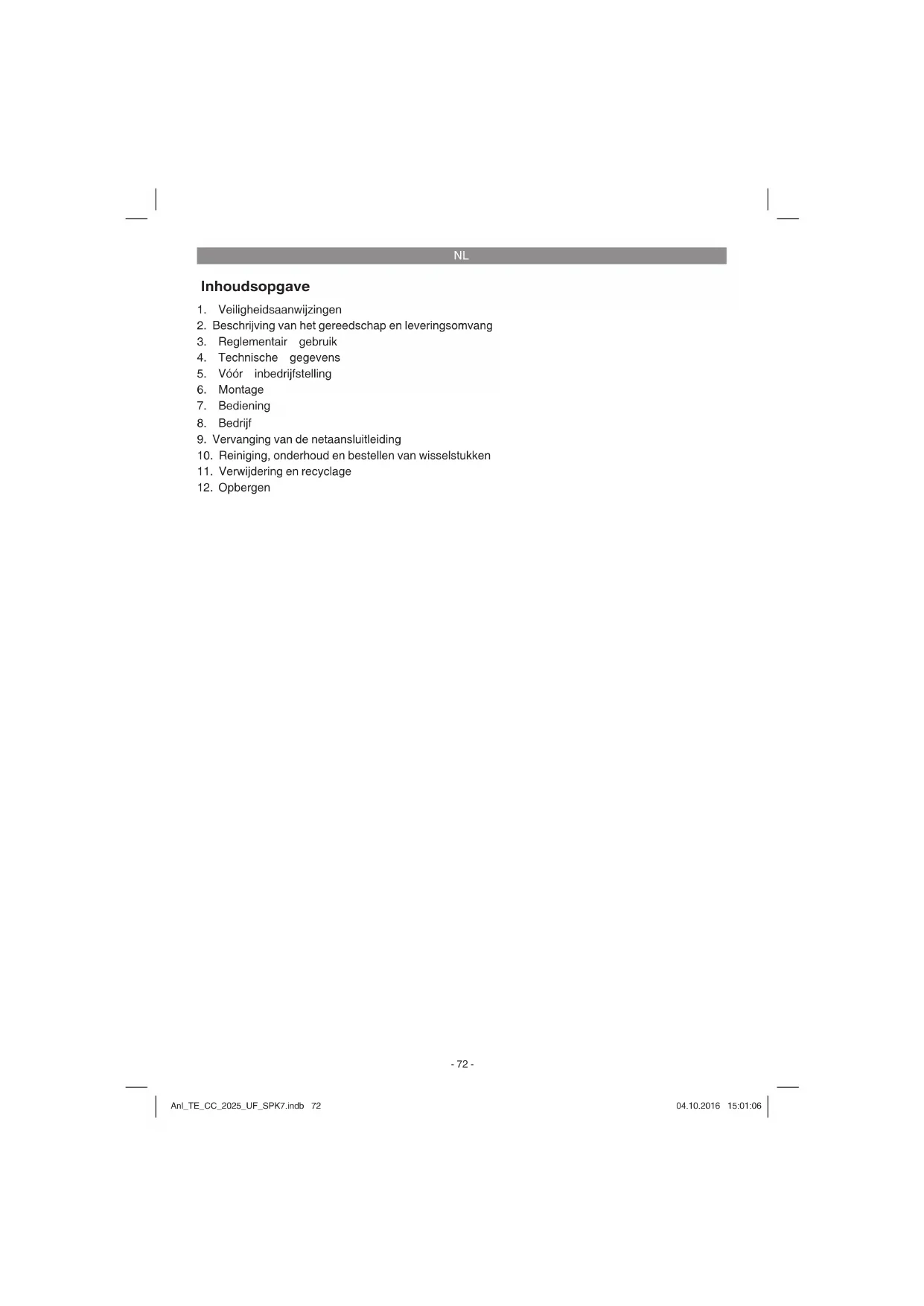 Bewaar het toestel en de accessoires op een don- kere, droge en vorstvrije plaats die voor kinderen ontoegankelijk is. De optimale opbergtemperatuur ligt tussen 5° C en 30° C. Bewaar het elektrische gereedschap in de originele verpakking. Anl_TE_CC_2025_UF_SPK7.indb 81Anl_TE_CC_2025_UF_SPK7.indb 81 04.10.2016 15:01:0604.10.2016 15:01:06NL