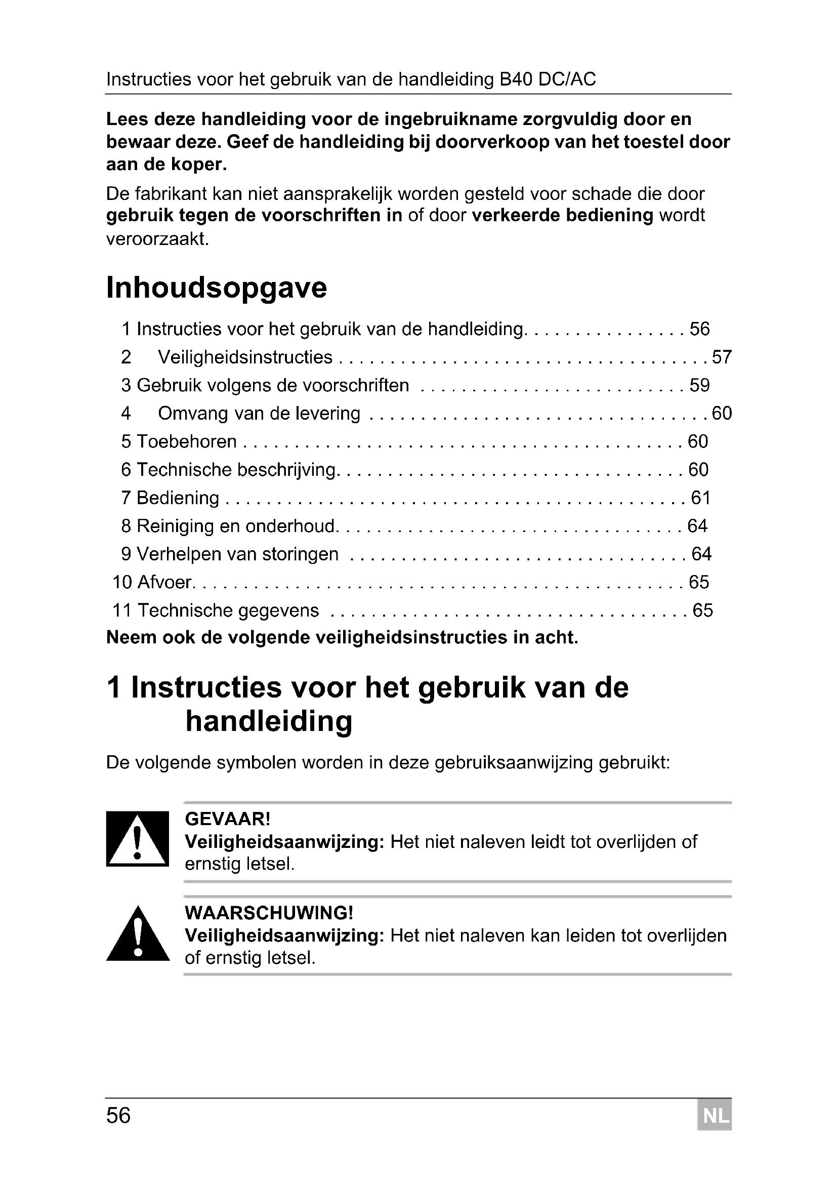WAARSCHUWING! Veiligheidsaanwijzing: Het niet naleven kan leiden tot overlijden of ernstig letsel. _B40.book Seite 56 Mittwoch, 20. April 2011 3:28 15NL B40 DC/AC Veiligheidsinstructies