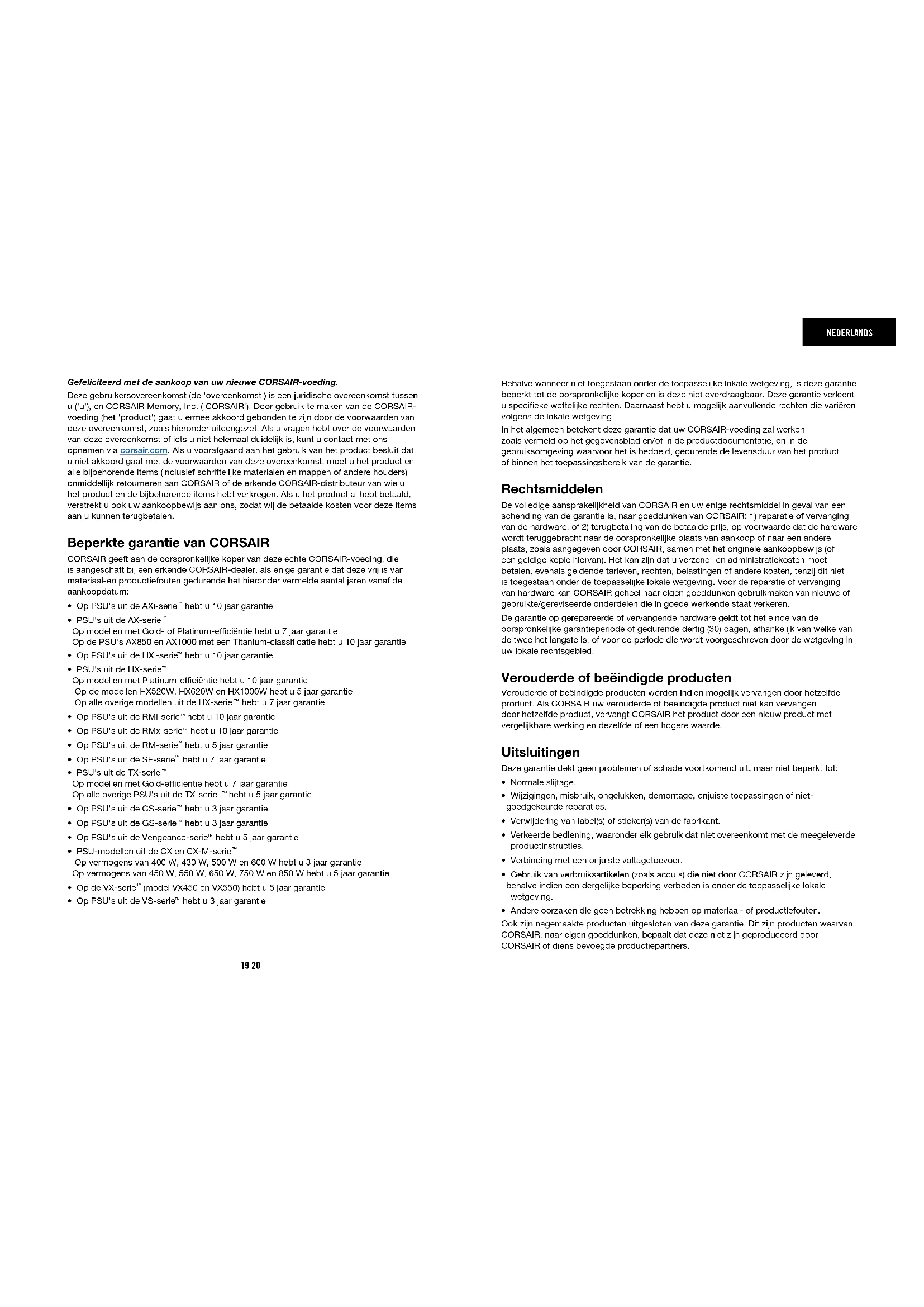 Sicherheitsbestimmungen führt zum sofortigen Verlust aller Gewährleistungen und Garantien.19 20 NEDERLANDS Gefeliciteerd met de aankoop van uw nieuwe CORSAIR-voeding. Deze gebruikersovereenkomst (de 'overeenkomst') is een juridische overeenkomst tussen u ('u'), en CORSAIR Memory, Inc. ('CORSAIR'). Door gebruik te maken van de CORSAIR- voeding (het 'product') gaat u ermee akkoord gebonden te zijn door de voorwaarden van deze overeenkomst, zoals hieronder uiteengezet. Als u vragen hebt over de voorwaarden van deze overeenkomst of iets u niet helemaal duidelijk is, kunt u contact met ons opnemen via corsair.com. Als u voorafgaand aan het gebruik van het product besluit dat u niet akkoord gaat met de voorwaarden van deze overeenkomst, moet u het product en alle bijbehorende items (inclusief schriftelijke materialen en mappen of andere houders) onmiddellijk retourneren aan CORSAIR of de erkende CORSAIR-distributeur van wie u het product en de bijbehorende items hebt verkregen. Als u het product al hebt betaald, verstrekt u ook uw aankoopbewijs aan ons, zodat wij de betaalde kosten voor deze items aan u kunnen terugbetalen. Beperkte garantie van CORSAIR CORSAIR geeft aan de oorspronkelijke koper van deze echte CORSAIR-voeding, die is aangeschaft bij een erkende CORSAIR-dealer, als enige garantie dat deze vrij is van materiaal-en productiefouten gedurende het hieronder vermelde aantal jaren vanaf de aankoopdatum: