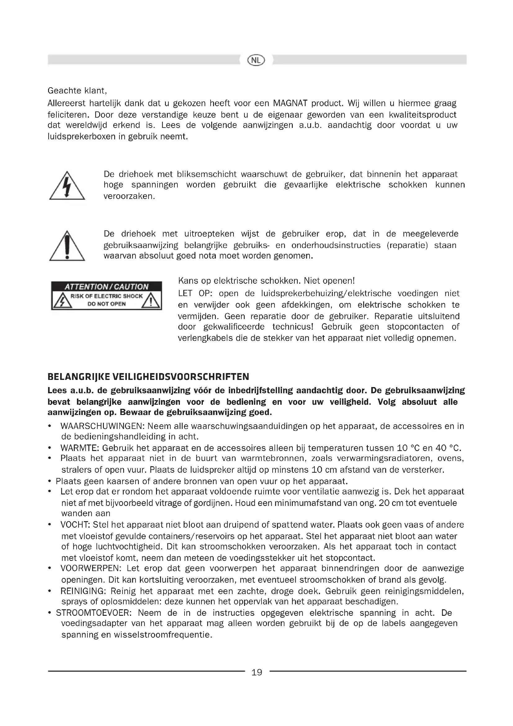 Geachte klant, Allereerst hartelijk dank dat u gekozen heeft voor een MAGNAT product. Wij willen u hiermee graag feliciteren. Door deze verstandige keuze bent u de eigenaar geworden van een kwaliteitsproduct dat wereldwijd erkend is. Lees de volgende aanwijzingen a.u.b. aandachtig door voordat u uw luidsprekerboxen in gebruik neemt. De driehoek met bliksemschicht waarschuwt de gebruiker, dat binnenin het apparaat hoge spanningen worden gebruikt die gevaarlijke elektrische schokken kunnen veroorzaken. De driehoek met uitroepteken wijst de gebruiker erop, dat in de meegeleverde gebruiksaanwijzing belangrijke gebruiks- en onderhoudsinstructies (reparatie) staan waarvan absoluut goed nota moet worden genomen. Kans op elektrische schokken. Niet openen! LET OP: open de luidsprekerbehuizing/elektrische voedingen niet en verwijder ook geen afdekkingen, om elektrische schokken te vermijden. Geen reparatie door de gebruiker. Reparatie uitsluitend door gekwaliceerde technicus! Gebruik geen stopcontacten of verlengkabels die de stekker van het apparaat niet volledig opnemen. BELANGRIJKE VEILIGHEIDSVOORSCHRIFTEN Lees a.u.b. de gebruiksaanwijzing vóór de inbedrijfstelling aandachtig door. De gebruiksaanwijzing bevat belangrijke aanwijzingen voor de bediening en voor uw veiligheid. Volg absoluut alle aanwijzingen op. Bewaar de gebruiksaanwijzing goed.