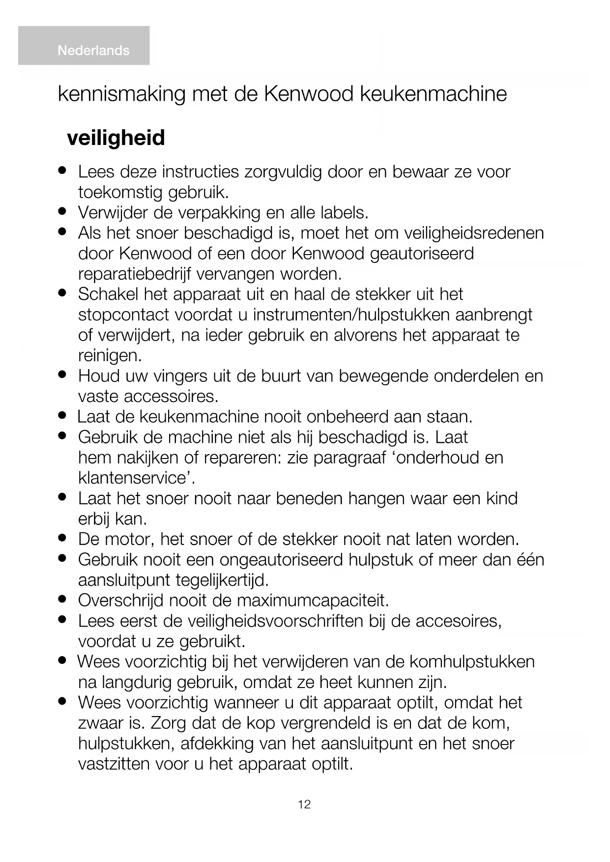kennismaking met de Kenwood keukenmachine Nederlandsl Verplaats de machine niet en haal de mixerkop niet omhoog als een hulpstuk aangebracht is, omdat de keukenmachine dan instabiel kan worden.