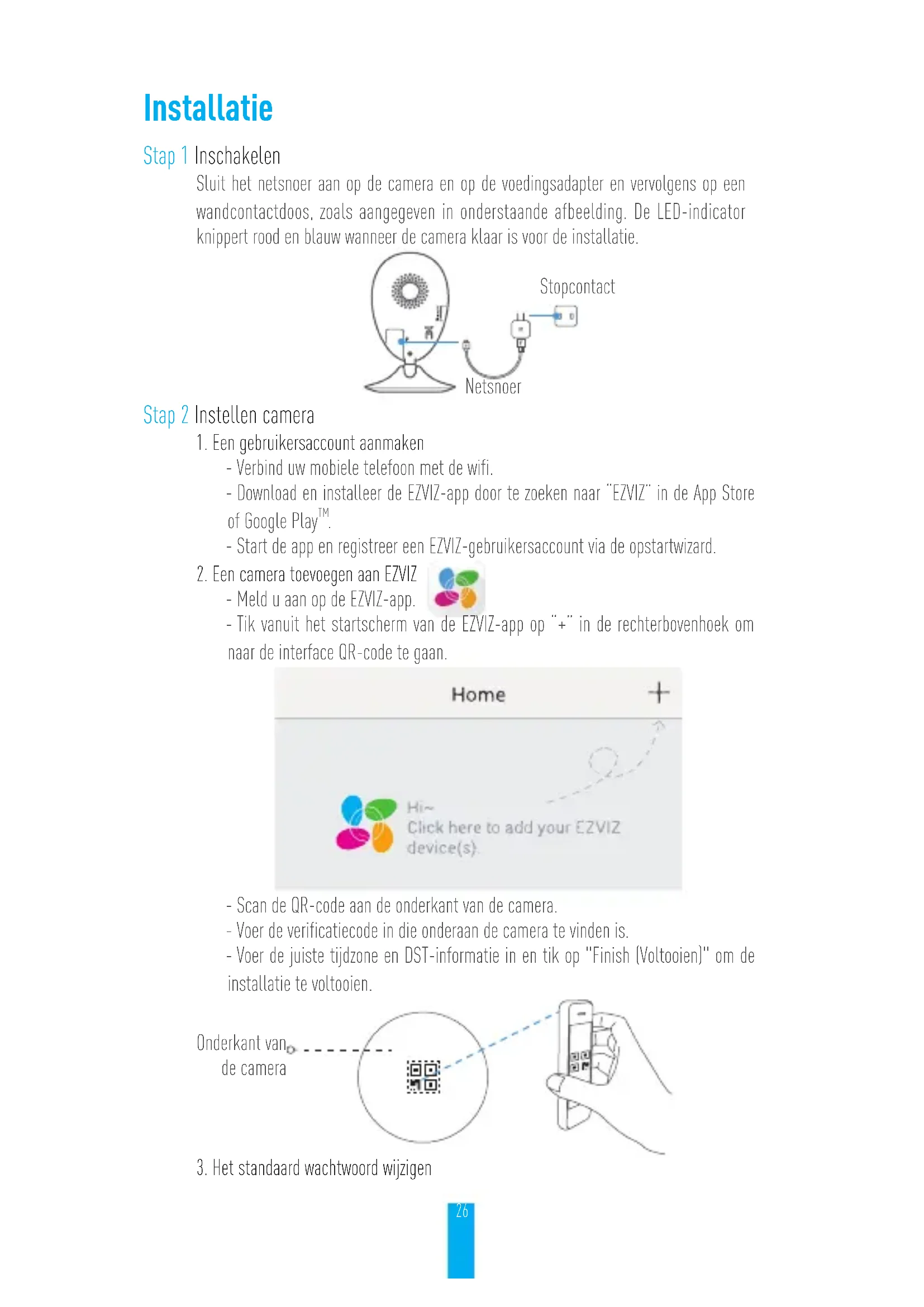 Si consiglia di utilizzare l'alimentatore standard EZVIZ per assicurare una tensione di alimentazione stabile. Per ulteriori informazioni, visitare www.ezvizlife.com.26 Installatie Stap 1 Inschakelen Sluit het netsnoer aan op de camera en op de voedingsadapter en vervolgens op een wandcontactdoos, zoals aangegeven in onderstaande afbeelding. De LED-indicator knippert rood en blauw wanneer de camera klaar is voor de installatie. Stap 2 Instellen camera