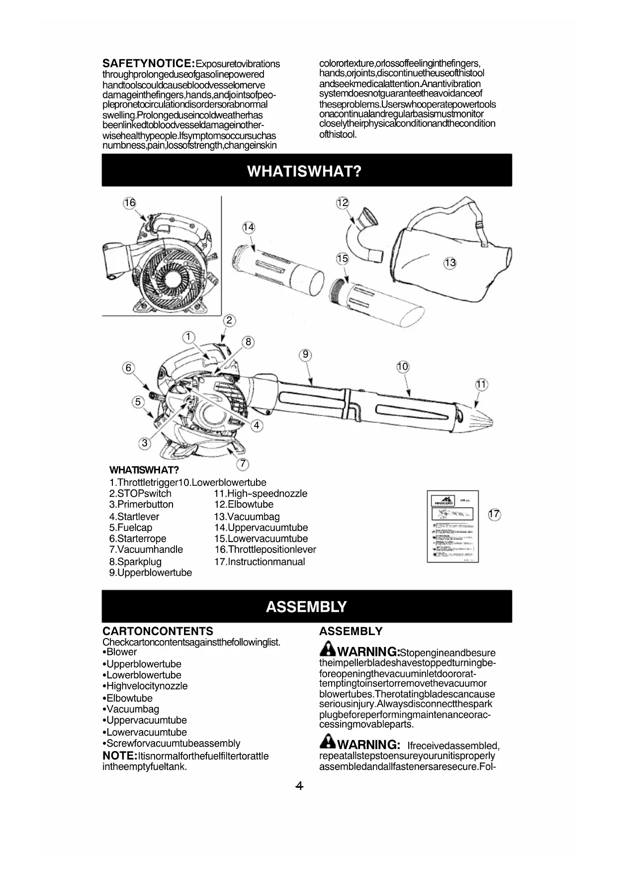 WAT IS WAT? ASSEMBLEREN DOOSINHOUD Controleer of de doos de volgende onderdelen bevat. S Blower S Bovenste blower--buis S Onderste blower--buis S Hogesnelheids mondstuk S Elleboogbuis S Vacuümzak S Bovenste vacuüm-buis S Onderste vacuüm-buis S Schroef voor vacuüm--buis assemblage LET OP: Het is normaal dat het brandstoffilter in de lege brandstoftank rammelt. ASSEMBLEREN WAARSCHUWING: Stop de motor en wees er zeker van dat de rotorbladen niet langer draaien alvorens u de afsluiting van de vacuüminlaat opent of een poging doet de vacuümbuizen of blower--buizen aan te brengen of te verwijderen. De roterende bladen kunnen ernstig letsel veroorzaken. Koppel de bougie los alvorens u onderhoud pleegt. WAARSCHUWING: Indien u het apparaat geassembleerd heeft gekregen, dient u alle stappen te herhalen om er zeker van te zijn dat uw apparaat op de juiste wijze is geassembleerden dat alle sluitingenstevig dicht zitten. D Voor het assembleren is schroevedraaier nodig.