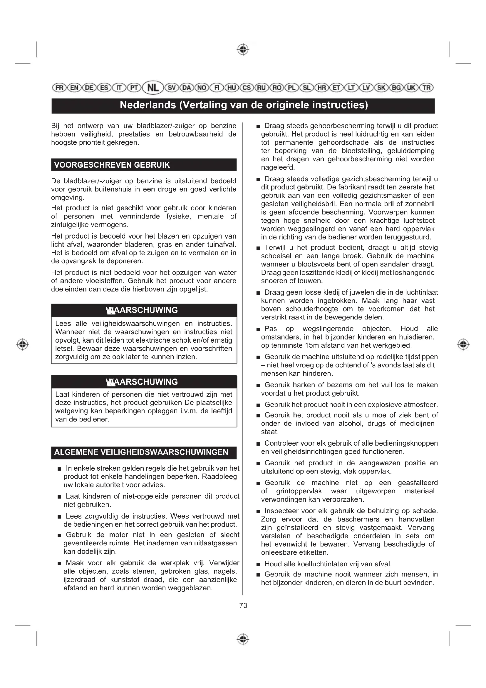 NOTAS: ■ Als het product in stoffige gebieden wordt gebruikt moet er vaker onderhoud worden gepleegd. ■ Mesmo quando o produto tiver ultrapassado os valores máximos especificados na tabela, continue a fazer os ciclos de manutenção aos intervalos de tempo ou às horas de funcionamento aqui indicadas.73 Nederlands (Vertaling van de originele instructies) Bij het ontwerp van uw bladblazer/-zuiger op benzine hebben veiligheid, prestaties en betrouwbaarheid de hoogste prioriteit gekregen. VOORGESCHREVEN GEBRUIK De bladblazer/-zuiger op benzine is uitsluitend bedoeld voor gebruik buitenshuis in een droge en goed verlichte omgeving. Het product is niet geschikt voor gebruik door kinderen of personen met verminderde fysieke, mentale of zintuigelijke vermogens. Het product is bedoeld voor het blazen en opzuigen van licht afval, waaronder bladeren, gras en ander tuinafval. Het is bedoeld om afval op te zuigen en te vermalen en in de opvangzak te deponeren. Het product is niet bedoeld voor het opzuigen van water of andere vloeistoffen. Gebruik het product voor andere doeleinden dan deze die hierboven zijn opgelijst. WAARSCHUWING Lees alle veiligheidswaarschuwingen en instructies. Wanneer niet de waarschuwingen en instructies niet opvolgt, kan dit leiden tot elektrische schok en/of ernstig letsel. Bewaar deze waarschuwingen en voorschriften zorgvuldig om ze ook later te kunnen inzien. WAARSCHUWING Laat kinderen of personen die niet vertrouwd zijn met deze instructies, het product gebruiken De plaatselijke wetgeving kan beperkingen opleggen i.v.m. de leeftijd van de bediener. ALGEMENE VEILIGHEIDSWAARSCHUWINGEN ■ In enkele streken gelden regels die het gebruik van het product tot enkele handelingen beperken. Raadpleeg uw lokale autoriteit voor advies. ■ Laat kinderen of niet-opgeleide personen dit product niet gebruiken. ■ Lees zorgvuldig de instructies. Wees vertrouwd met de bedieningen en het correct gebruik van het product. ■ Gebruik de motor niet in een gesloten of slecht geventileerde ruimte. Het inademen van uitlaatgassen kan dodelijk zijn. ■ Maak voor elk gebruik de werkplek vrij. Verwijder alle objecten, zoals stenen, gebroken glas, nagels, ijzerdraad of kunststof draad, die een aanzienlijke afstand en hard kunnen worden weggeblazen. ■ Draag steeds gehoorbescherming terwijl u dit product gebruikt. Het product is heel luidruchtig en kan leiden tot permanente gehoordschade als de instructies ter beperking van de blootstelling, geluiddemping en het dragen van gehoorbescherming niet worden nageleefd. ■ Draag steeds volledige gezichtsbescherming terwijl u dit product gebruikt. De fabrikant raadt ten zeerste het gebruik aan van een volledig gezichtsmasker of een gesloten veiligheidsbril. Een normale bril of zonnebril is geen afdoende bescherming. Voorwerpen kunnen tegen hoge snelheid door een krachtige luchtstoot worden weggeslingerd en vanaf een hard oppervlak in de richting van de bediener worden teruggestuurd. ■ Terwijl u het product bedient, draagt u altijd stevig schoeisel en een lange broek. Gebruik de machine wanneer u blootsvoets bent of open sandalen draagt. Draag geen loszittende kledij of kledij met loshangende snoeren of touwen. ■ Draag geen losse kledij of juwelen die in de luchtinlaat kunnen worden ingetrokken. Maak lang haar vast boven schouderhoogte om te voorkomen dat het verstrikt raakt in de bewegende delen. ■ Pas op wegslingerende objecten. Houd alle omstanders, in het bijzonder kinderen en huisdieren, op tenminste 15m afstand van het werkgebied. ■ Gebruik de machine uitsluitend op redelijke tijdstippen – niet heel vroeg op de ochtend of 's avonds laat als dit mensen kan hinderen. ■ Gebruik harken of bezems om het vuil los te maken voordat u het product gebruikt. ■ Gebruik het product nooit in een explosieve atmosfeer. ■ Gebruik het product nooit als u moe of ziek bent of onder de invloed van alcohol, drugs of medicijnen staat. ■ Controleer voor elk gebruik of alle bedieningsknoppen en veiligheidsinrichtingen goed functioneren. ■ Gebruik het product in de aangewezen positie en uitsluitend op een stevig, vlak oppervlak. ■ Gebruik de machine niet op een geasfalteerd of grintoppervlak waar uitgeworpen materiaal verwondingen kan veroorzaken. ■ Inspecteer voor elk gebruik de behuizing op schade. Zorg ervoor dat de beschermers en handvatten zijn geïnstalleerd en stevig vastgemaakt. Vervang versleten of beschadigde onderdelen in sets om het evenwicht te bewaren. Vervang beschadigde of onleesbare etiketten. ■ Houd alle koelluchtinlaten vrij van afval. ■ Gebruik de machine nooit wanneer zich mensen, in het bijzonder kinderen, en dieren in de buurt bevinden.74 Nederlands (Vertaling van de originele instructies) ■ Vermijd gebruik van het product bij slecht weer, vooral als er gevaar voor bliksem bestaat. ■ Gebruik dit apparaat niet op plekken waar u niet goed kunt zien. De gebruiker heeft een duidelijk overzicht nodig van het werkgebied om mogelijke gevaren te identificeren. ■ Het gebruik van gelijksoortige apparaten in de nabijheid verhoogt het risico van letsel en de mogelijkheid dat er andere mensen in uw werkgebied komen. ■ Zorg ervoor dat u altijd stevig vast staat op hellingen. Stap altijd, loop nooit. ■ Ga altijd stevig op uw benen staan en reik niet te ver weg met uw arm. Overrek u niet. Rek u niet uit, waardoor u uw evenwicht kunt verliezen. ■ Plaats uw handen of enig ander lichaamsdeel of kledingsstuk niet in de voedingskamer, uitlaatklep of in de buurt van een bewegend deel. ■ Gebruik het product nooit met een defecte beschermer of schild of zonder veiligheidsvoorzieningen, bijvoorbeeld een afvalcollector. ■ Het apparaat op geen enkele wijze aanpassen of reserveonderdelen gebruiken die niet worden aanbevolen door de fabrikant. WAARSCHUWING Voordat u het product in de zuigermodus gebruikt moet u eerst de onderste en bovenste zuigerbuizen aan elkaar bevestigen. Dit hoeft slechts één keer gedaan te worden. Gebruik d
