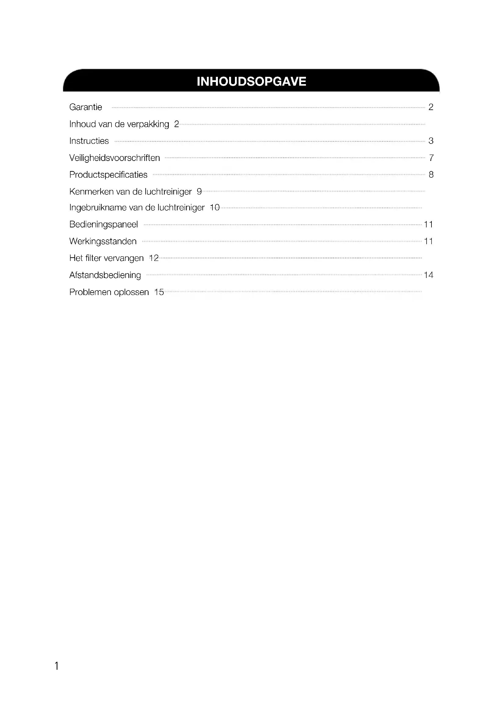 Gebruik Laat kinderen NOOIT op of in de buurt van de luchtreiniger spelen. Vul de luchtreiniger NOOIT met warm water. Spuit NOOIT ontvlambare vloeistoffen of gassen in het apparaat. Gebruik NOOIT ontvlambare materialen (zoals benzeen of alcohol) om de luchtreiniger schoon te maken. Leg NOOIT kleding of handdoeken op de luchtreiniger als deze aan staat. Spuit bij het schoonmaken NOOIT vloeistoffen rechtstreeks in de luchtreiniger. Plaats het apparaat NOOIT in direct zonlicht. U mag de luchtreiniger NOOIT ergens tegenaan stoten of laten vallen.VEILIGHEIDSVOORSCHRIFTEN Hartelijk dank voor de aanschaf van een Winix-luchtreiniger. Lees deze handleiding vóór gebruik zorgvuldig door. Dit product is uitsluitend bedoeld voor huishoudelijk gebruik. BELANGRIJKE AANDACHTSPUNTEN