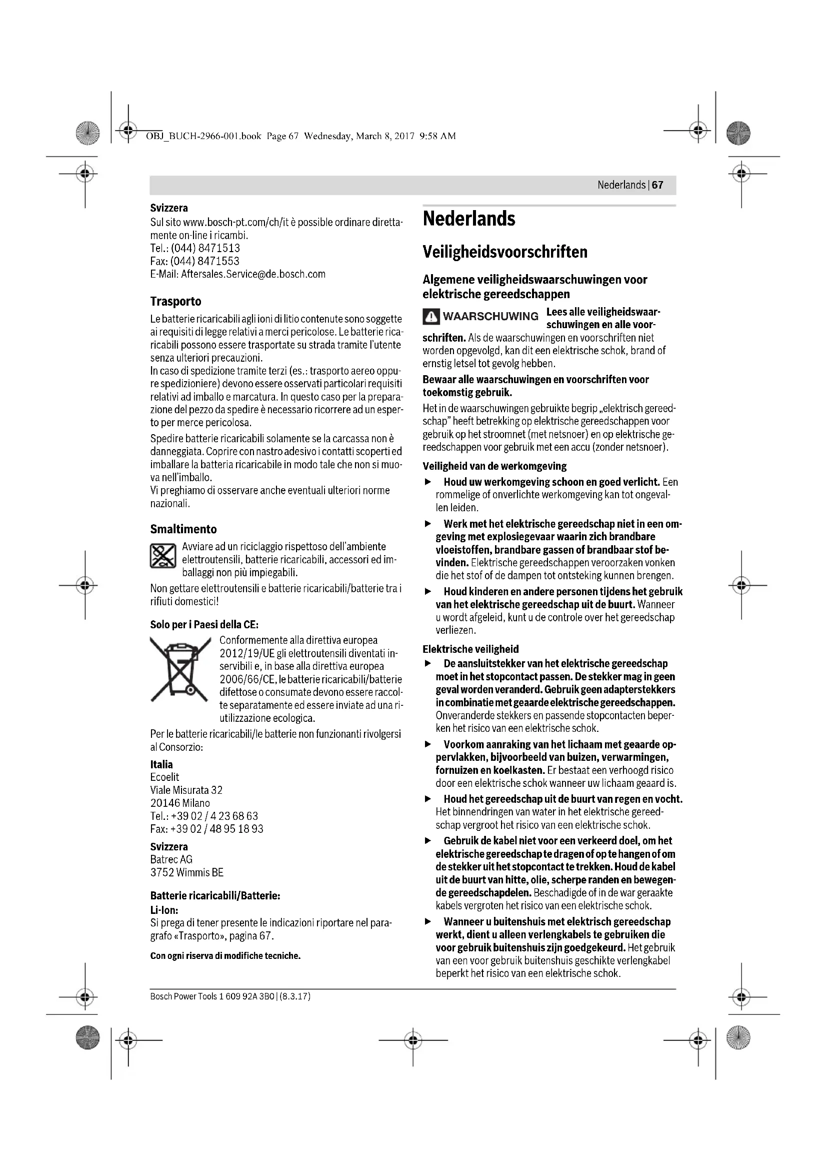OBJ_BUCH-2966-001.book Page 64 Wednesday, March 8, 2017 9:58 AMItaliano | 65 Bosch Power Tools 1 609 92A 3B0 | (8.3.17) Aspirazione polvere/aspirazione trucioli Polveri e materiali come vernici contenenti piombo, alcuni ti- pi di legname, minerali e metalli possono essere dannosi per la salute. Il contatto oppure l’inalazione delle polveri posso- no causare reazioni allergiche e/o malattie delle vie respira- torie dell’operatore oppure delle persone che si trovano nel- le vicinanze. Determinate polveri come polvere da legname di faggio o di quercia sono considerate cancerogene, in modo particolare insieme ad additivi per il trattamento del legname (cromato, protezione per legno). Materiale contenente amianto deve essere lavorato esclusivamente da personale specializzato. – Utilizzare possibilmente un’aspirazione polvere adatta per il materiale. – Provvedere per una buona aerazione del posto di lavoro. – Si consiglia di portare una mascherina protettiva con classe di filtraggio P2. Osservare le norme in vigore nel Vostro paese per i mate- riali da lavorare. Evitare accumuli di polvere sul posto di lavoro. Le pol- veri si possono incendiare facilmente. Collegamento dell’aspirazione polvere (accessorio opzionale) Il dispositivo di aspirazione polvere 20 è destinato esclusiva- mente per lavori con la piastra di levigatura 13, in combinazio- ne con altri accessori lo stesso non è di alcuna utilità. Per la levigatura collegare sempre un’aspirazione della polvere. Per il montaggio del dispositivo di aspirazione polvere 20 (ac- cessorio) rimuovere l’accessorio e la guida di profondità 15. Spingere il dispositivo di aspirazione della polvere 20 fino a battuta oltre l’attacco utensile 10 sul collarino di fissaggio dell’elettroutensile. Ruotare il dispositivo di aspirazione della polvere nella posizione desiderata (non direttamente sotto l’elettroutensile). Chiudere la leva di bloccaggio 21 premen- dola, per fissare il dispositivo di aspirazione della polvere. Inserire la bussola portautensile del tubo di aspirazione 18 sull’innesto per aspirazione 19. Collegare il tubo di aspirazio- ne 18 ad un aspiratore (accessorio). Una vista generale relativa all’attacco ad aspirapolveri diffe- renti è riportata sulla pagina con la rappresentazione grafica. L’aspirapolvere deve essere adatto per il materiale da lavorare. Utilizzare un aspiratore speciale per l’aspirazione di polveri particolarmente nocive per la salute, cancerogene oppure polveri asciutte. Uso Messa in funzione Applicazione della batteria ricaricabile Nota bene: L’utilizzo di batterie ricaricabili che non siano adatte all’elettroutensile in dotazione può provocare disfun- zioni oppure arrecare danni all’elettroutensile. Spingere dal dietro la batteria ricaricabile 4 carica nella base dell’elettroutensile. Premere completamente la batteria rica- ricabile nella base fino a quando la striscia rossa non è più vi- sibile e la batteria ricaricabile è bloccata in modo sicuro. Accendere/spegnere Per accendere l’ettroutensile, spingere l’interruttore di avvio/ arresto 2 in avanti in modo che sull’interruttore si veda «I». L’avviamento dolce elettronico limita il momento di coppia durante la fase della messa in esercizio aumentando la durata del motore. In caso di funzionamento a vuoto e carico, la funzione Costant Electronic mantiene il numero di oscillazioni costante e garan- tisce una prestazione operativa uniforme. Per spegnere l’ettroutensile, spingere l’interruttore di avvio/ arresto 2 all’indietro in modo che sull’interruttore si veda «0». Per risparmiare energia accendere l’elettroutensile solo se lo stesso viene utilizzato. La banda luminosa a 180° migliora le condizioni di visibilità nelle immediate vicinanze dell’area di lavoro. Si accende e si spegne automaticamente con l’elettroutensile. Non guardare direttamente nella luce di lavoro, può ac- cecare. Preselezione della frequenza di oscillazione Tramite la rotellina per la preselezione del numero di oscilla- zioni 6 è possibile preselezionare la frequenza di oscillazione richiesta anche in fase di funzionamento. Il numero di oscillazioni necessario dipende dal tipo di mate- riale in lavorazione e dalle specifiche condizioni operative e può essere dunque determinato a seconda del caso eseguen- do delle prove pratiche. In caso di lavori di taglio, tranciatura e levigatura di materiali duri come ad es. legno o metallo si consiglia l’impiego dei livel- li di numero di oscillazioni «6», in caso di materiali morbidi co- me ad es. plastica il livello di numero di oscillazioni «4». Indicazioni operative Prima di posare l’elettroutensile, attendere sempre fino a quando si sarà fermato completamente. Prima di ogni intervento sull’elettroutensile, estrarre la batteria ricaricabile. Nota bene: Tenendo chiuse durante il lavoro le prese di ven- tilazione 7 dell’elettroutensile, viene ridotta la durata dell’elettroutensile stesso. Durante il lavoro con utensili HCS prestare attenzione affin- ché il rivestimento dell’utensile non venga danneggiato. Principio operativo Tramite l’azionamento oscillante, l’elettroutensile oscilla fino a 20000 volte al minuto per 2,8°. Questo consente lavori pre- cisi in uno spazio ristretto. Lavorare con una pressione scarsa ed uni- forme altrimenti peggiora la prestazione operativa e l’accessorio può bloccarsi. Durante il lavoro muovere avanti ed indietro l’elettroutensile affinché l’accessorio non si riscaldi troppo e non si blocchi. OBJ_BUCH-2966-001.book Page 65 Wednesday, March 8, 2017 9:58 AM66 | Italiano 1 609 92A 3B0 | (8.3.17) Bosch Power Tools Tagli Utilizzare esclusivamente lame integre ed in perfette condizioni. Lame deformate oppure non affilate possono rompersi, influenzare negativamente il taglio oppure cau- sare un contraccolpo. In caso di lavori di taglio di materiali leggeri da costru- zione, rispettare le vigenti norme legislative e le racco- mandaz
