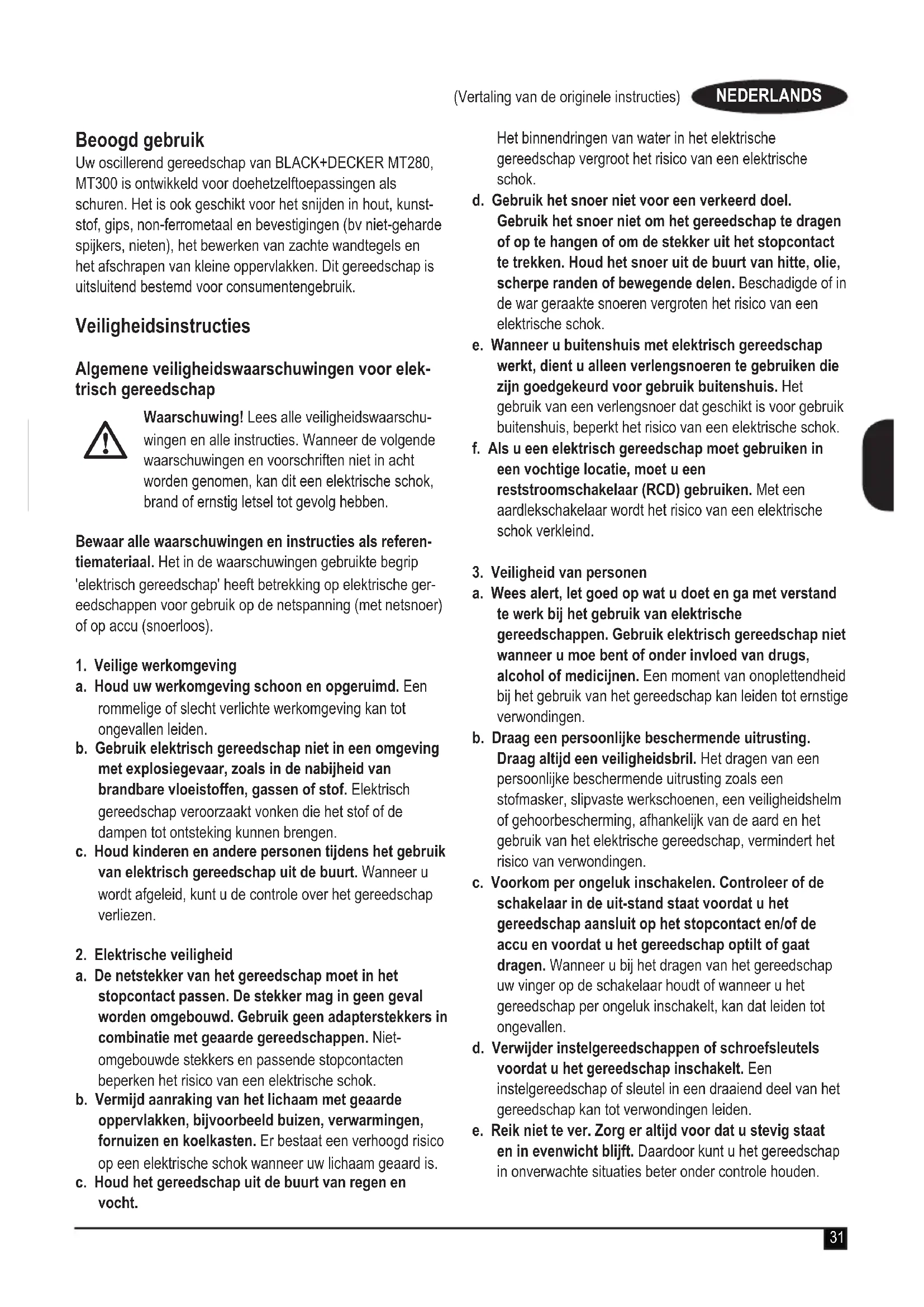 MT300, MT280 oscillerend gereedschap Black & Decker verklaart dat deze producten, die zijn beschre- ven onder "Technische gegevens", voldoen aan: 2006/42/EC, EN 60745-1:2009 +A11:2010, EN 60745-2-4:2009 +A11:2011 Deze producten voldoen tevens aan richtlijn 2004/108/EG (tot 19/04/2016) 2014/30/EU (vanaf 20/04/2016) en 2011/65/EU. Neem voor meer informatie contact op met Black & Decker op het volgende adres of raadpleeg de achterzijde van de handleiding. Ondergetekende is verantwoordelijk voor de compilatie van het technische bestand en geeft deze verklaring namens Black & Decker af. R.Laverick Director of Engineering Black & Decker Europe, 210 Bath Road, Slough, Berkshire, SL1 3YD Verenigd Koninkrijk 20/10/2015 Garantie Black & Decker heeft vertrouwen in haar producten en biedt een uitstekende garantie. Deze garantiebepalingen vormen een aanvulling op uw wettelijke rechten en beperken deze niet. De garantie geldt in de lidstaten van de Europese Unie en de Europese Vrijhandelsassociatie. Mocht uw Black & Decker product binnen 24 maanden na de datum van aankoop defect raken ten gevolge van materiaal- of constructiefouten, dan garanderen wij de kosteloze vervan- ging van defecte onderdelen, de reparatie van het product of de vervanging van het product, tenzij: u Het product is gebruikt voor handelsdoeleinden, profes- sionele toepassingen of verhuurdoeleinden. u Het product onoordeelkundig is gebruikt. u Het product is beschadigd door invloeden van buitenaf of door een ongeval. u Reparaties zijn uitgevoerd door anderen dan onze ser- vicecentra of Black & Decker-personeel. Om een beroep te doen op de garantie, dient u een aankoopbewijs te overhandigen aan de verkoper of een van onze servicecentra. U kunt het adres van het dichtstbijzijnde Black & Decker-servicecentrum opvragen via de adressen op de achterzijde van deze handleiding. U kunt ook een lijst van Black & Decker-servicecentra en meer informatie m.b.t. onze klantenservice vinden op internet op: www.2helpU.com Meld u aan op onze website www.blackanddecker.nl om te worden geïnformeerd over nieuwe producten en speciale aanbiedingen. Verdere informatie over het merk BLACK+DECKER en onze producten vindt u op www. blackanddecker.nl.38 (Traducción de las instrucciones originales) ESPAÑOL Uso especíco La herramienta oscilante BLACK+DECKER MT280, MT300 ha sido diseñada para diversas aplicaciones de bricolaje, tales como operaciones de lijado. También es apropiada para cortar materiales de madera, plástico, yeso, metales no ferrosos y elementos de sujeción (p. ej. clavos sin endurecer, grapas), trabajar con azulejos blandos y para raspar peque- ñas supercies. Esta herramienta está pensada únicamente para uso doméstico. Instrucciones de seguridad Advertencias de seguridad generales para herrami- entas eléctricas