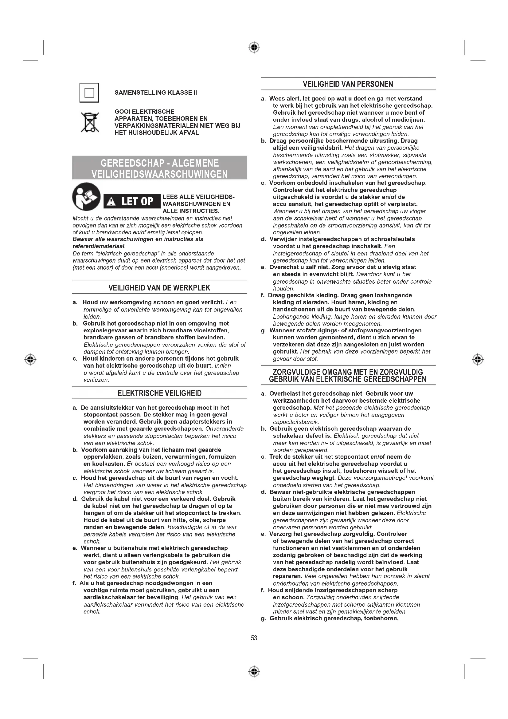 LET OP LEES ALLE VEILIGHEIDS-WAARSCHUWINGEN EN ALLE INSTRUCTIES. Mocht u de onderstaande waarschuwingen en instructies niet opvolgen dan kan er zich mogelijk een elektrische schok voordoen of kunt u brandwonden en/of ernstig letsel oplopen. Bewaar alle waarschuwingen en instructies als referentiemateriaal. De term “elektrisch gereedschap” in alle onderstaande waarschuwingen duidt op een elektrisch apparaat dat door het net (met een snoer) of door een accu (snoerloos) wordt aangedreven.