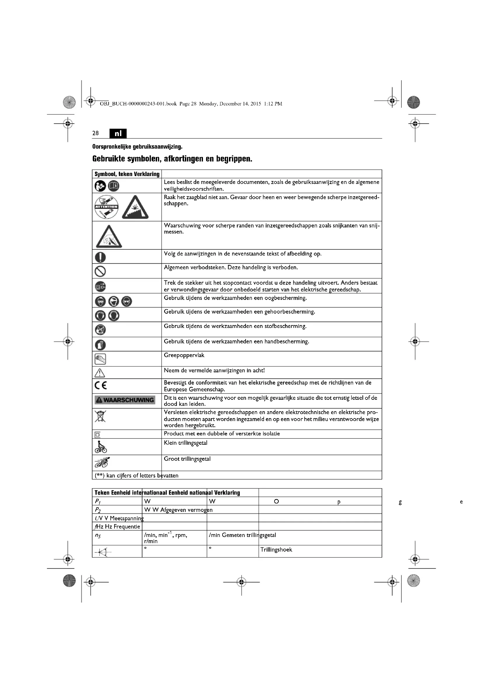 Oorspronkelijke gebruiksaanwijzing. Gebruikte symbolen, afkortingen en begrippen. Symbool, teken Verklaring Lees beslist de meegeleverde documenten, zoals de gebruiksaanwijzing en de algemene veiligheidsvoorschriften. Raak het zaagblad niet aan. Gevaar door heen en weer bewegende scherpe inzetgereed- schappen. Waarschuwing voor scherpe randen van inzetgereedschappen zoals snijkanten van snij- messen. Volg de aanwijzingen in de nevenstaande tekst of afbeelding op. Algemeen verbodsteken. Deze handeling is verboden. Trek de stekker uit het stopcontact voordat u deze handeling uitvoert. Anders bestaat er verwondingsgevaar door onbedoeld starten van het elektrische gereedschap. Gebruik tijdens de werkzaamheden een oogbescherming. Gebruik tijdens de werkzaamheden een gehoorbescherming. Gebruik tijdens de werkzaamheden een stofbescherming. Gebruik tijdens de werkzaamheden een handbescherming. Greepoppervlak Neem de vermelde aanwijzingen in acht! Bevestigt de conformiteit van het elektrische gereedschap met de richtlijnen van de Europese Gemeenschap. Dit is een waarschuwing voor een mogelijk gevaarlijke situatie die tot ernstig letsel of de dood kan leiden. Versleten elektrische gereedschappen en andere elektrotechnische en elektrische pro- ducten moeten apart worden ingezameld en op een voor het milieu verantwoorde wijze worden hergebruikt. Product met een dubbele of versterkte isolatie Klein trillingsgetal Groot trillingsgetal (**) kan cijfers of letters bevatten Teken Eenheid internationaal Eenheid nationaal Verklaring
