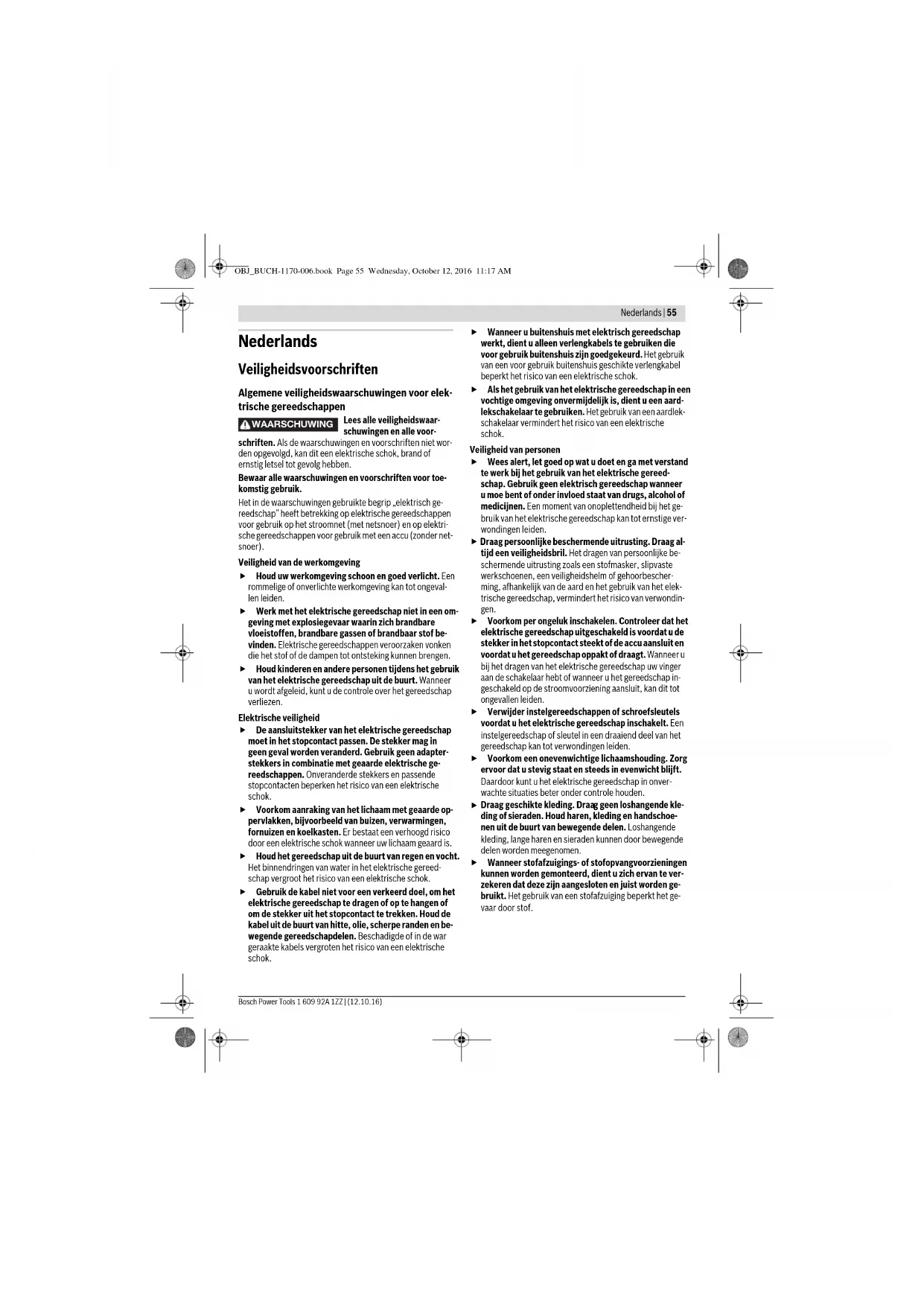 dello stato di carica della batteria 4. Dopo lo spegnimento automatico spegnere l’elettroutensile. Attendere fino a quando la temperatura della batteria sarà ri- tornata nel campo ammissibile prima di riaccendere di nuovo l’apparecchio. Indicazioni per l’uso ottimale della batteria ricaricabile Proteggere la batteria ricaricabile da umidità ed acqua. Conservare la batteria ricaricabile esclusivamente nel campo di temperatura da –20 °C fino a 50 °C. Non lasciare la batte- ria ricaricabile p.es. in estate nell’automobile. Una sensibile riduzione della durata del funzionamento dopo l’operazione di ricarica sta ad indicare che la batteria ricarica- bile dovrà essere sostituita. Si prega di attenersi alle indicazioni relative allo smaltimento. Manutenzione ed assistenza Manutenzione e pulizia Prima di effettuare lavori all’elettroutensile (p. es. la- vori di manutenzione, cambio d’utensile, ecc.), nonché in caso di trasporto e di conservazione dello stesso, avere sempre cura di estrarne sempre la batteria rica- ricabile. In caso d’azionamento accidentale dell’interrut- tore di avvio/di arresto sussisterà il pericolo di incidenti. OBJ_BUCH-1170-006.book Page 53 Wednesday, October 12, 2016 11:17 AM54 | Italiano 1 609 92A 1ZZ | (12.10.16) Bosch Power Tools Per poter garantire buone e sicure operazioni di lavoro, tenere sempre puliti l’elettroutensile e le prese di ven- tilazione. Pulire regolarmente con una spazzola metallica gli accessori scanalati (accessori). Assistenza clienti e consulenza impieghi In caso di richieste o di ordinazione di pezzi di ricambio, co- municare sempre il codice prodotto a 10 cifre riportato sulla targhetta di fabbricazione dell’elettroutensile! Il servizio di assistenza risponde alle Vostre domande relative alla riparazione ed alla manutenzione del Vostro prodotto nonché concernenti le parti di ricambio. Disegni in vista esplosa ed informazioni relative alle parti di ricambio sono consultabili anche sul sito: www.bosch-pt.com Il team Bosch che si occupa della consulenza impieghi vi aiu- terà in caso di domande relative ai nostri prodotti ed ai loro accessori. Italia Officina Elettroutensili Robert Bosch S.p.A. Corso Europa, ang. Via Trieste 20 20020 LAINATE (MI) Tel.: (02) 3696 2663 Fax: (02) 3696 2662 Fax: (02) 3696 8677 E-Mail: officina.elettroutensili@it.bosch.com Svizzera Sul sito www.bosch-pt.com/ch/it è possible ordinare diretta- mente on-line i ricambi. Tel.: (044) 8471513 Fax: (044) 8471553 E-Mail: Aftersales.Service@de.bosch.com Trasporto Le batterie ricaricabili agli ioni di litio contenute sono soggette ai requisiti di legge relativi a merci pericolose. Le batterie rica- ricabili possono essere trasportate su strada tramite l’utente senza ulteriori precauzioni. In caso di spedizione tramite terzi (es.: trasporto aereo oppu- re spedizioniere) devono essere osservati particolari requisiti relativi ad imballo e marcatura. In questo caso per la prepara- zione del pezzo da spedire è necessario ricorrere ad un esper- to per merce pericolosa. Spedire batterie ricaricabili solamente se la carcassa non è danneggiata. Coprire con nastro adesivo i contatti scoperti ed imballare la batteria ricaricabile in modo tale che non si muo- va nell’imballo. Vi preghiamo di osservare anche eventuali ulteriori norme na- zionali. Smaltimento Avviare ad un riciclaggio rispettoso dell’ambiente elettroutensili, batterie ricaricabili, accessori ed im- ballaggi non più impiegabili. Non gettare elettroutensili e batterie ricaricabili/batterie tra i rifiuti domestici! Solo per i Paesi della CE: Conformemente alla direttiva europea 2012/19/UE gli elettroutensili diventati in- servibili e, in base alla direttiva europea 2006/66/CE, le batterie ricaricabili/batte- rie difettose o consumate devono essere raccolte separatamente ed essere inviate ad una riutilizzazione ecologica. Per le batterie ricaricabili/le batterie non funzionanti rivolger- si al Consorzio: Italia Ecoelit Viale Misurata 32 20146 Milano Tel.: +39 02 / 4 23 68 63 Fax: +39 02 / 48 95 18 93 Svizzera Batrec AG 3752 Wimmis BE Batterie ricaricabili/Batterie: Li-Ion: Si prega di tener presente le indicazio- ni riportare nel paragrafo «Trasporto», pagina 54. Con ogni riserva di modifiche tecniche. OBJ_BUCH-1170-006.book Page 54 Wednesday, October 12, 2016 11:17 AMNederlands | 55 Bosch Power Tools 1 609 92A 1ZZ | (12.10.16) Nederlands Veiligheidsvoorschriften Algemene veiligheidswaarschuwingen voor elek- trische gereedschappen Lees alle veiligheidswaar- schuwingen en alle voor- schriften. Als de waarschuwingen en voorschriften niet wor- den opgevolgd, kan dit een elektrische schok, brand of ernstig letsel tot gevolg hebben. Bewaar alle waarschuwingen en voorschriften voor toe- komstig gebruik. Het in de waarschuwingen gebruikte begrip „elektrisch ge- reedschap” heeft betrekking op elektrische gereedschappen voor gebruik op het stroomnet (met netsnoer) en op elektri- sche gereedschappen voor gebruik met een accu (zonder net- snoer). Veiligheid van de werkomgeving Houd uw werkomgeving schoon en goed verlicht. Een rommelige of onverlichte werkomgeving kan tot ongeval- len leiden. Werk met het elektrische gereedschap niet in een om- geving met explosiegevaar waarin zich brandbare vloeistoffen, brandbare gassen of brandbaar stof be- vinden. Elektrische gereedschappen veroorzaken vonken die het stof of de dampen tot ontsteking kunnen brengen. Houd kinderen en andere personen tijdens het gebruik van het elektrische gereedschap uit de buurt. Wanneer u wordt afgeleid, kunt u de controle over het gereedschap verliezen. Elektrische veiligheid De aansluitstekker van het elektrische gereedschap moet in het stopcontact passen. De stekker mag in geen geval worden veranderd. Gebruik geen adapter- stekkers in combinatie met geaarde elektrische ge- reedschappen. Onveranderde stekkers en passende stopcontacten beperken het risico van een elektrische schok. Voorkom aanraking van het lichaam met geaard
