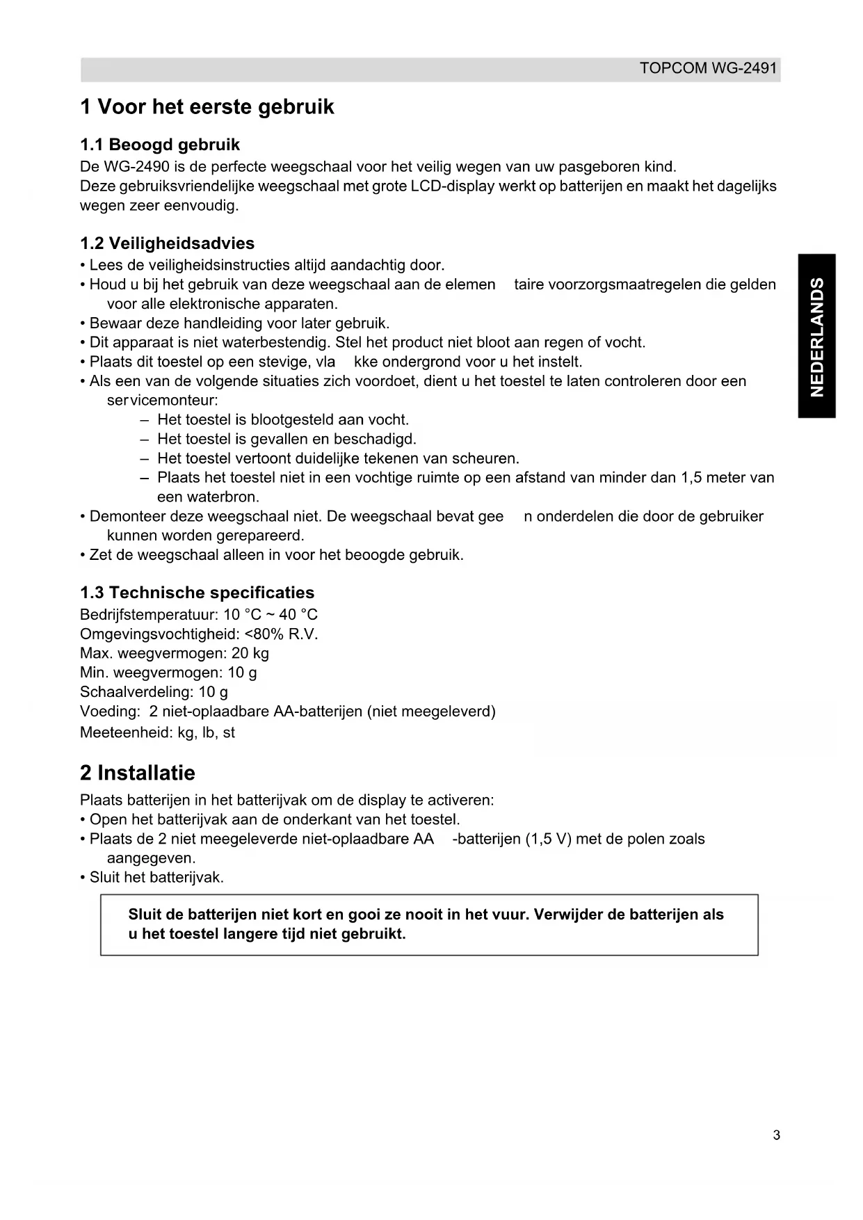 O-Ld Batterijen bijna leeg - vervangen. Overbelasting. De baby weegt meer dan 20 kg. 6 Reinigen Reinig de weegschaal met een licht vochtige doek of antistatische doek. Gebruik nooit reinigingsmiddelen of schurende oplosmiddelen.5 NEDERLANDS TOPCOM WG-2491 7 Afvoeren van het toestel (milieu) Na afloop van de levenscyclus van het product mag u het niet met het normale huishoudelijke afval weggooien, maar moet u h et naar een inzamelpunt brengen voor recycling van elektrische en elektronische apparatuur. Dit wordt aangeduid door het symbool op het product, in de handleiding en/of op de verpakking. Sommige materialen waaruit het product is ver vaardigd kunnen worden hergebruikt als u ze naar een inzamelpunt brengt. Door onderdelen of grondstoffen van gebruikte producten te hergebruiken, levert u een belangrijke bijdrage aan de bescherming van het milieu. Wend u tot de plaatselijke overheid voor meer informatie over de inzamelpunten bij u in de buurt. Verwijder de batterijen voordat u het toestel naar een inzamelpunt brengt. Voer de batterijen op een milieuvriendelijke manier af volgens de regels die gelden in uw land. 8 Topcom-garantie