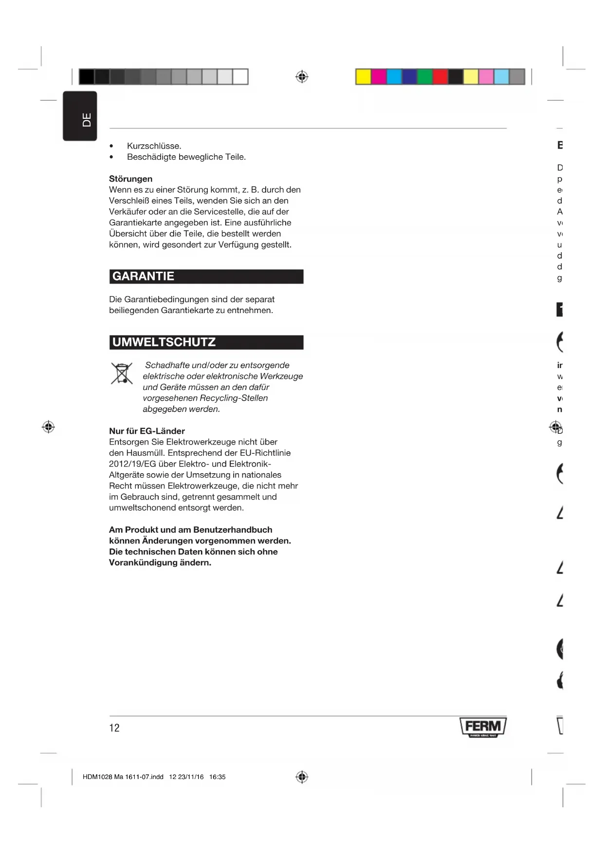 - Schadeaanbewegendedelen. Storingen Wanneer er zich een storing voordoet, bijvoorbeeld bij slijtage van een onderdeel, neem dan contact op met de verkoper of het servicebedrijf op de garantiekaart. Achter in deze handleiding ziet u een opengewerkte afbeelding van de onderdelen die besteld kunnen worden. GARANTIE Lees voor de garantievoorwaarden de apart bijgevoegde garantiekaart. MILIEU Defecte en/of afgedankte elektrische of elektronische gereedschappen dienen ter verwerking te worden aangeboden aan een daarvoor verantwoordelijke instantie. Uitsluitend voor EG-landen Werp elektrisch gereedschap niet weg bij het huisvuil. Conform de Europese Richtlijn 2012/19/ EG voor Afgedankte Elektrische en Elektronische Apparatuur en de implementatie ervan in nationaal recht moet niet langer te gebruiken elektrisch gereedschap gescheiden worden verzameld en op een milieuvriendelijke wijze worden verwerkt. Het product en de gebruikershandleiding zijn onderhevig aan wijzigingen. Specificaties kunnen zonder opgaaf van redenen worden gewijzigd. HDM1028 Ma 1611-07.indd 16 23/11/16 16:3517
