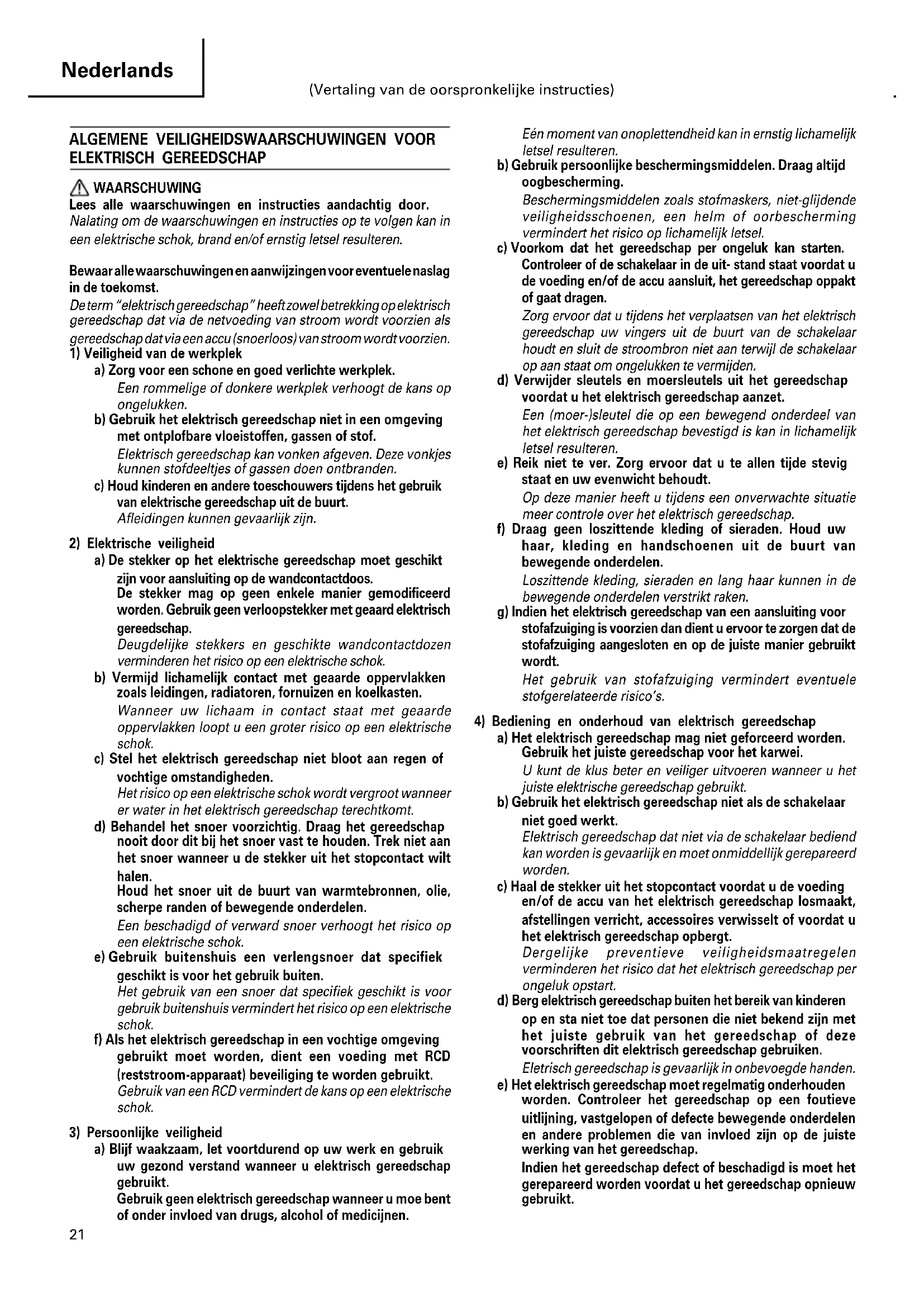 a) Blijf waakzaam, let voortdurend op uw werk en gebruik uw gezond verstand wanneer u elektrisch gereedschap gebruikt. Gebruik geen elektrisch gereedschap wanneer u moe bent of onder invloed van drugs, alcohol of medicijnen. Eén moment van onoplettendheid kan in ernstig lichamelijk letsel resulteren. b) Gebruik persoonlijke beschermingsmiddelen. Draag altijd oogbescherming. Beschermingsmiddelen zoals stofmaskers, niet-glijdende veiligheidsschoenen, een helm of oorbescherming vermindert het risico op lichamelijk letsel. c) Voorkom dat het gereedschap per ongeluk kan starten. Controleer of de schakelaar in de uit- stand staat voordat u de voeding en/of de accu aansluit, het gereedschap oppakt of gaat dragen. Zorg ervoor dat u tijdens het verplaatsen van het elektrisch gereedschap uw vingers uit de buurt van de schakelaar houdt en sluit de stroombron niet aan terwijl de schakelaar op aan staat om ongelukken te vermijden. d) Verwijder sleutels en moersleutels uit het gereedschap voordat u het elektrisch gereedschap aanzet. Een (moer-)sleutel die op een bewegend onderdeel van het elektrisch gereedschap bevestigd is kan in lichamelijk letsel resulteren. e) Reik niet te ver. Zorg ervoor dat u te allen tijde stevig staat en uw evenwicht behoudt. Op deze manier heeft u tijdens een onverwachte situatie meer controle over het elektrisch gereedschap. f) Draag geen loszittende kleding of sieraden. Houd uw haar, kleding en handschoenen uit de buurt van bewegende onderdelen. Loszittende kleding, sieraden en lang haar kunnen in de bewegende onderdelen verstrikt raken. g) Indien het elektrisch gereedschap van een aansluiting voor stofafzuiging is voorzien dan dient u ervoor te zorgen dat de stofafzuiging aangesloten en op de juiste manier gebruikt wordt. Het gebruik van stofafzuiging vermindert eventuele stofgerelateerde risico’s.