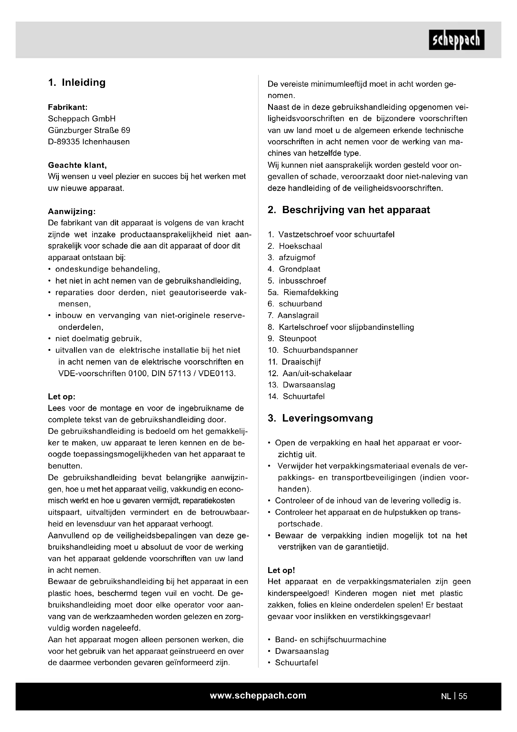 - uitvallen van de elektrische installatie bij het niet in acht nemen van de elektrische voorschriften en VDE-voorschriften 0100, DIN 57113 / VDE0113. Let op: Lees voor de montage en voor de ingebruikname de complete tekst van de gebruikshandleiding door. De gebruikshandleiding is bedoeld om het gemakkelij- ker te maken, uw apparaat te leren kennen en de be- oogde toepassingsmogelijkheden van het apparaat te benutten. De gebruikshandleiding bevat belangrijke aanwijzin- gen, hoe u met het apparaat veilig, vakkundig en econo- misch werkt en hoe u gevaren vermijdt, reparatiekosten uitspaart, uitvaltijden vermindert en de betrouwbaar- heid en levensduur van het apparaat verhoogt. Aanvullend op de veiligheidsbepalingen van deze ge- bruikshandleiding moet u absoluut de voor de werking van het apparaat geldende voorschriften van uw land in acht nemen. Bewaar de gebruikshandleiding bij het apparaat in een plastic hoes, beschermd tegen vuil en vocht. De ge- bruikshandleiding moet door elke operator voor aan- vang van de werkzaamheden worden gelezen en zorg- vuldig worden nageleefd. Aan het apparaat mogen alleen personen werken, die voor het gebruik van het apparaat geïnstrueerd en over de daarmee verbonden gevaren geïnformeerd zijn.www.scheppach.com