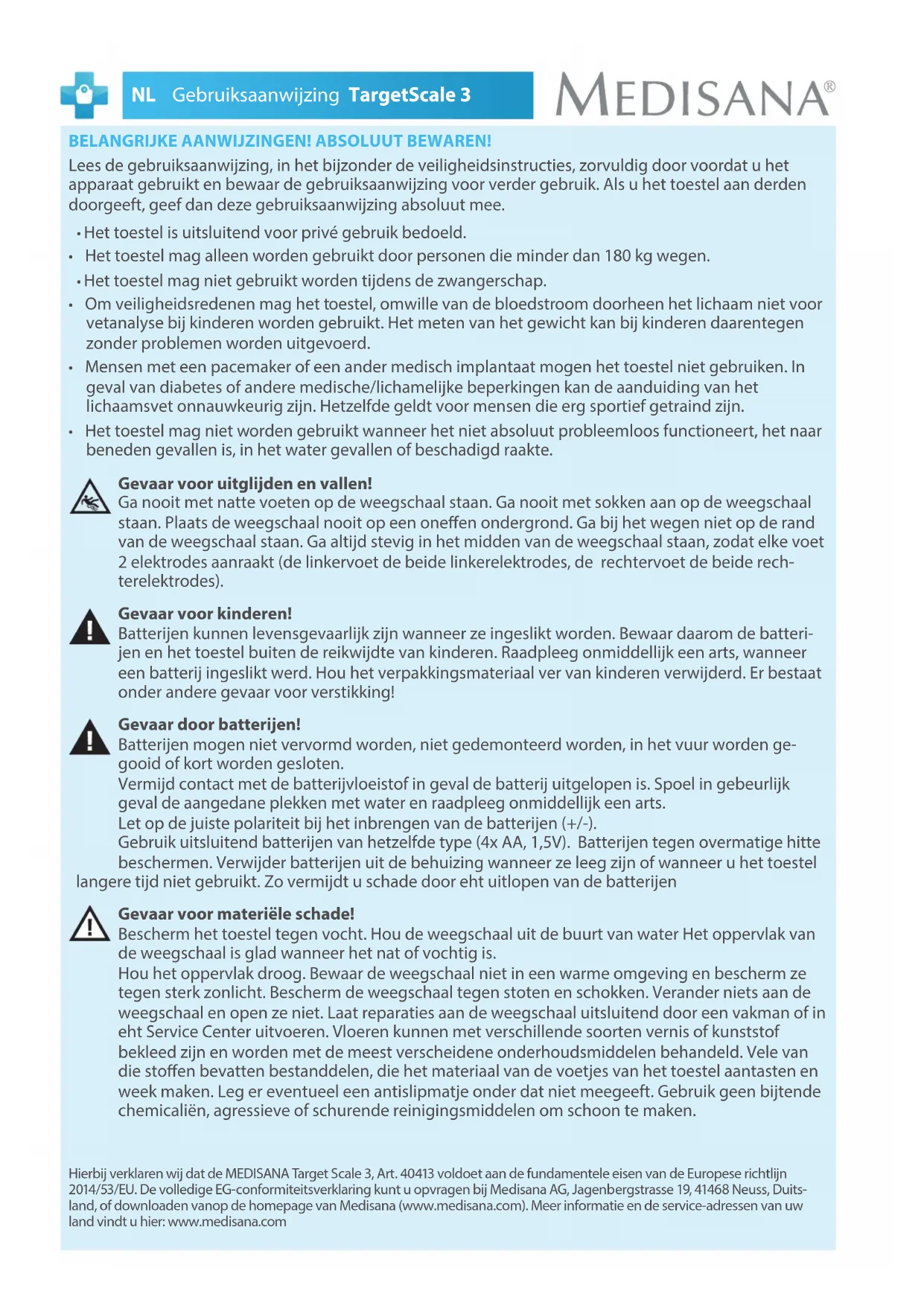 - Het toestel mag niet worden gebruikt wanneer het niet absoluut probleemloos functioneert, het naar beneden gevallen is, in het water gevallen of beschadigd raakte. Gevaar voor uitglijden en vallen! Ga nooit met natte voeten op de weegschaal staan. Ga nooit met sokken aan op de weegschaal staan. Plaats de weegschaal nooit op een oneen ondergrond. Ga bij het wegen niet op de rand van de weegschaal staan. Ga altijd stevig in het midden van de weegschaal staan, zodat elke voet 2 elektrodes aanraakt (de linkervoet de beide linkerelektrodes, de rechtervoet de beide rech- terelektrodes). Gevaar voor kinderen! Batterijen kunnen levensgevaarlijk zijn wanneer ze ingeslikt worden. Bewaar daarom de batteri- jen en het toestel buiten de reikwijdte van kinderen. Raadpleeg onmiddellijk een arts, wanneer een batterij ingeslikt werd. Hou het verpakkingsmateriaal ver van kinderen verwijderd. Er bestaat onder andere gevaar voor verstikking! Gevaar door batterijen! Batterijen mogen niet vervormd worden, niet gedemonteerd worden, in het vuur worden ge- gooid of kort worden gesloten. Vermijd contact met de batterijvloeistof in geval de batterij uitgelopen is. Spoel in gebeurlijk geval de aangedane plekken met water en raadpleeg onmiddellijk een arts. Let op de juiste polariteit bij het inbrengen van de batterijen (+/-). Gebruik uitsluitend batterijen van hetzelfde type (4x AA, 1,5V). Batterijen tegen overmatige hitte beschermen. Verwijder batterijen uit de behuizing wanneer ze leeg zijn of wanneer u het toestel langere tijd niet gebruikt. Zo vermijdt u schade door eht uitlopen van de batterijen Gevaar voor materiële schade! Bescherm het toestel tegen vocht. Hou de weegschaal uit de buurt van water Het oppervlak van de weegschaal is glad wanneer het nat of vochtig is. Hou het oppervlak droog. Bewaar de weegschaal niet in een warme omgeving en bescherm ze tegen sterk zonlicht. Bescherm de weegschaal tegen stoten en schokken. Verander niets aan de weegschaal en open ze niet. Laat reparaties aan de weegschaal uitsluitend door een vakman of in eht Service Center uitvoeren. Vloeren kunnen met verschillende soorten vernis of kunststof bekleed zijn en worden met de meest verscheidene onderhoudsmiddelen behandeld. Vele van die stoen bevatten bestanddelen, die het materiaal van de voetjes van het toestel aantasten en week maken. Leg er eventueel een antislipmatje onder dat niet meegeeft. Gebruik geen bijtende chemicaliën, agressieve of schurende reinigingsmiddelen om schoon te maken. Hierbij verklaren wij dat de MEDISANA Target Scale 3, Art. 40413 voldoet aan de fundamentele eisen van de Europese richtlijn 2014/53/EU. De volledige EG-conformiteitsverklaring kunt u opvragen bij Medisana AG, Jagenbergstrasse 19, 41468 Neuss, Duits- land, of downloaden vanop de homepage van Medisana (www.medisana.com). Meer informatie en de service-adressen van uw land vindt u hier: www.medisana.com27 TargetScale 3 Gebruiksaanwijzing NL B) Instellen van de persoonlijke gegevens op de weegschaal / Wegen met de analysefunctie De weegschaal kan de gegevens (geslacht, atleetmodus, lengte, leeftijd) van 8 personen met telkens 30 geheugenplaatsen opslaan. De in de weegschaal vooringestelde waarden zijn: man, 165 cm, 30 jaar, kg.