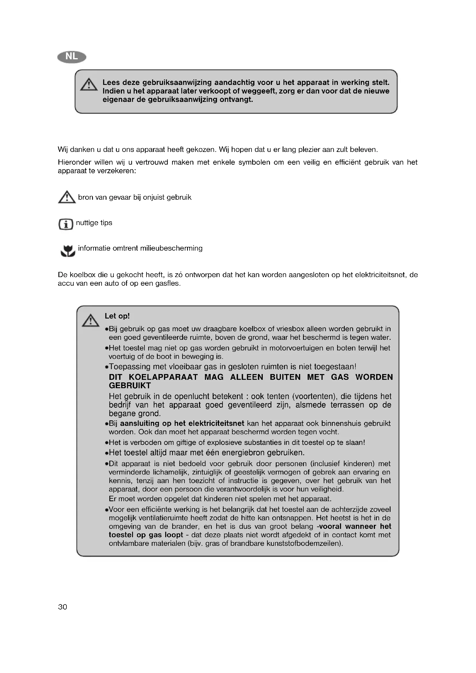 Wij danken u dat u ons apparaat heeft gekozen. Wij hopen dat u er lang plezier aan zult beleven. Hieronder willen wij u vertrouwd maken met enkele symbolen om een veilig en efficiënt gebruik van het apparaat te verzekeren: bron van gevaar bij onjuist gebruik nuttige tips informatie omtrent milieubescherming De koelbox die u gekocht heeft, is zó ontworpen dat het kan worden aangesloten op het elektriciteitsnet, de accu van een auto of op een gasfles. Let op! Bij gebruik op gas moet uw draagbare koelbox of vriesbox alleen worden gebruikt in een goed geventileerde ruimte, boven de grond, waar het beschermd is tegen water. Het toestel mag niet op gas worden gebruikt in motorvoertuigen en boten terwijl het voertuig of de boot in beweging is. Toepassing met vloeibaar gas in gesloten ruimten is niet toegestaan! DIT KOELAPPARAAT MAG ALLEEN BUITEN MET GAS WORDEN GEBRUIKT Het gebruik in de openlucht betekent : ook tenten (voortenten), die tijdens het bedrijf van het apparaat goed geventileerd zijn, alsmede terrassen op de begane grond. Bij aansluiting op het elektriciteitsnet kan het apparaat ook binnenshuis gebruikt worden. Ook dan moet het apparaat beschermd worden tegen vocht. Het is verboden om giftige of explosieve substanties in dit toestel op te slaan! Het toestel altijd maar met één energiebron gebruiken. Dit apparaat is niet bedoeld voor gebruik door personen (inclusief kinderen) met verminderde lichamelijk, zintuiglijk of geestelijk vermogen of gebrek aan ervaring en kennis, tenzij aan hen toezicht of instructie is gegeven, over het gebruik van het apparaat, door een persoon die verantwoordelijk is voor hun veiligheid. Er moet worden opgelet dat kinderen niet spelen met het apparaat. Voor een efficiënte werking is het belangrijk dat het toestel aan de achterzijde zoveel mogelijk ventilatieruimte heeft zodat de hitte kan ontsnappen. Het heetst is het in de omgeving van de brander, en het is dus van groot belang -vooral wanneer het toestel op gas loopt - dat deze plaats niet wordt afgedekt of in contact komt met ontvlambare materialen (bijv. gras of brandbare kunststofbodemzeilen). Lees deze gebruiksaanwijzing aandachtig voor u het apparaat in werking stelt. Indien u het apparaat later verkoopt of weggeeft, zorg er dan voor dat de nieuwe eigenaar de gebruiksaanwijzing ontvangt.31 INHOUD INHOUD